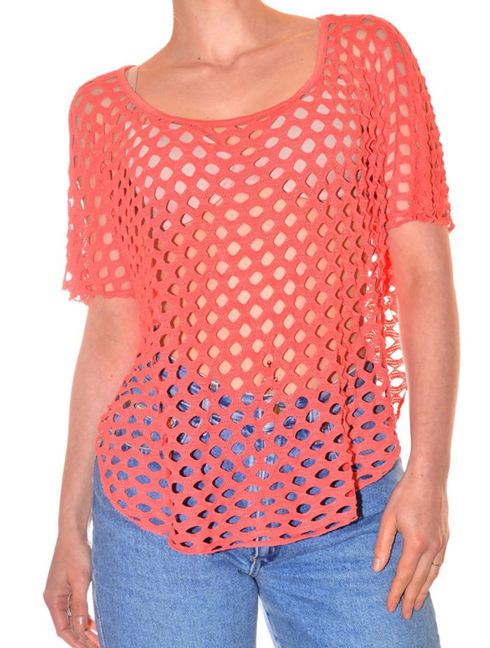 haut rose corail uni transparent fausses manches courtes col rond taille M/L