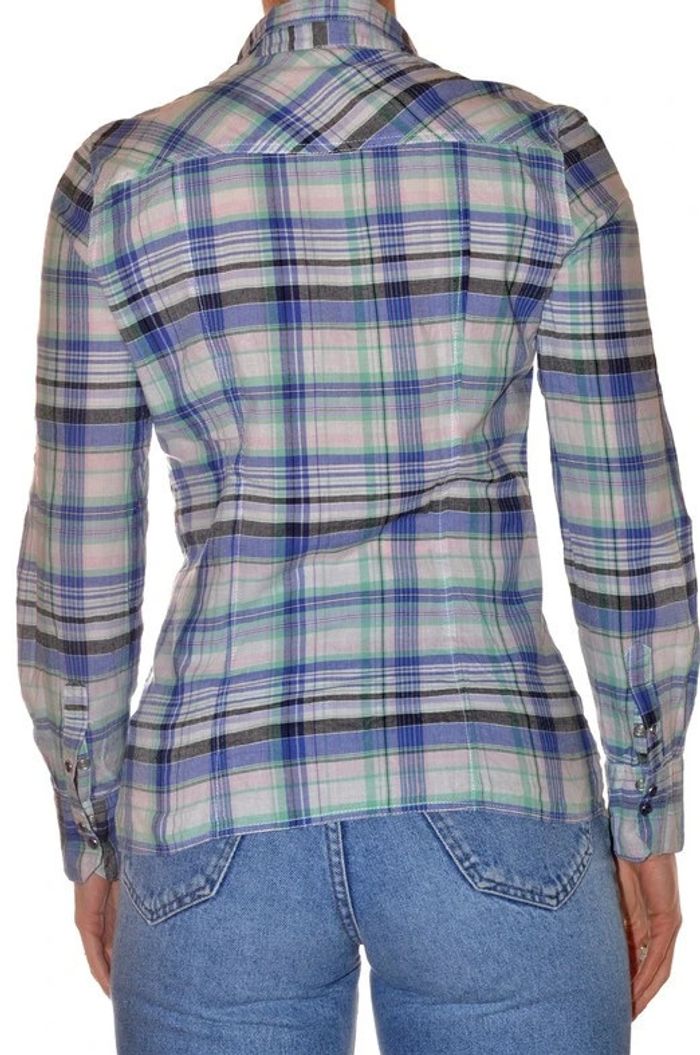 chemisier manches longues bleu et vert clair à motif rayures ajusté col V taille 36 - photo numéro 4