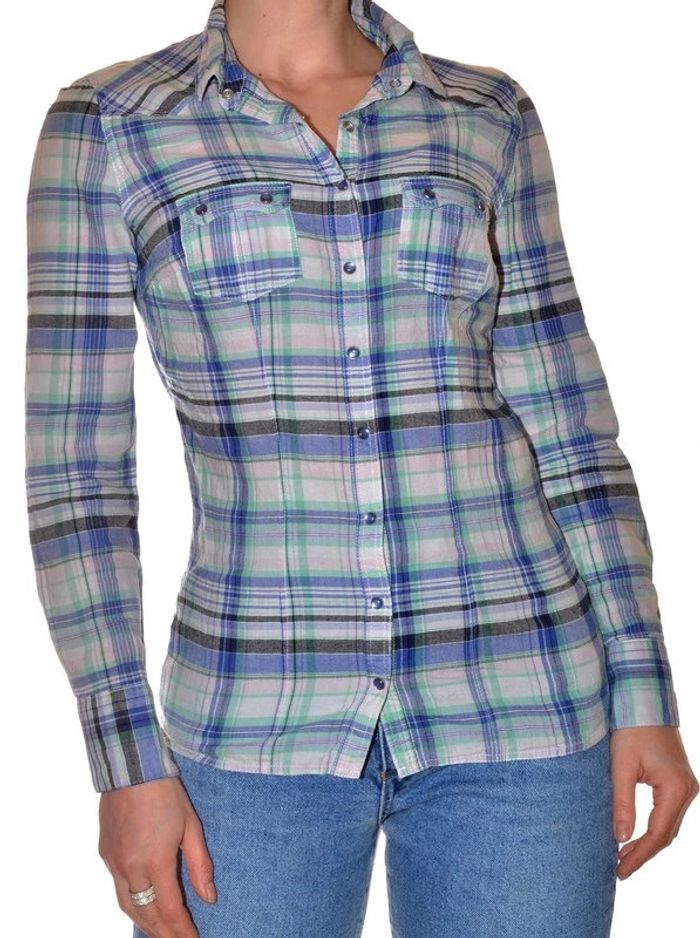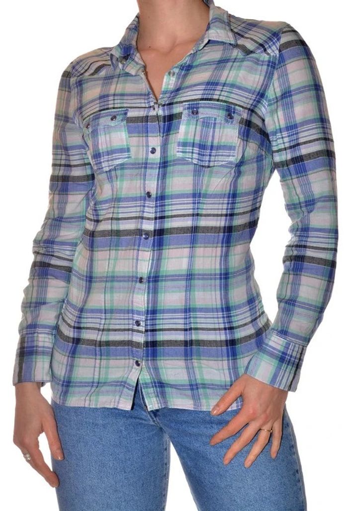 chemisier manches longues bleu et vert clair à motif rayures ajusté col V taille 36 - photo numéro 1