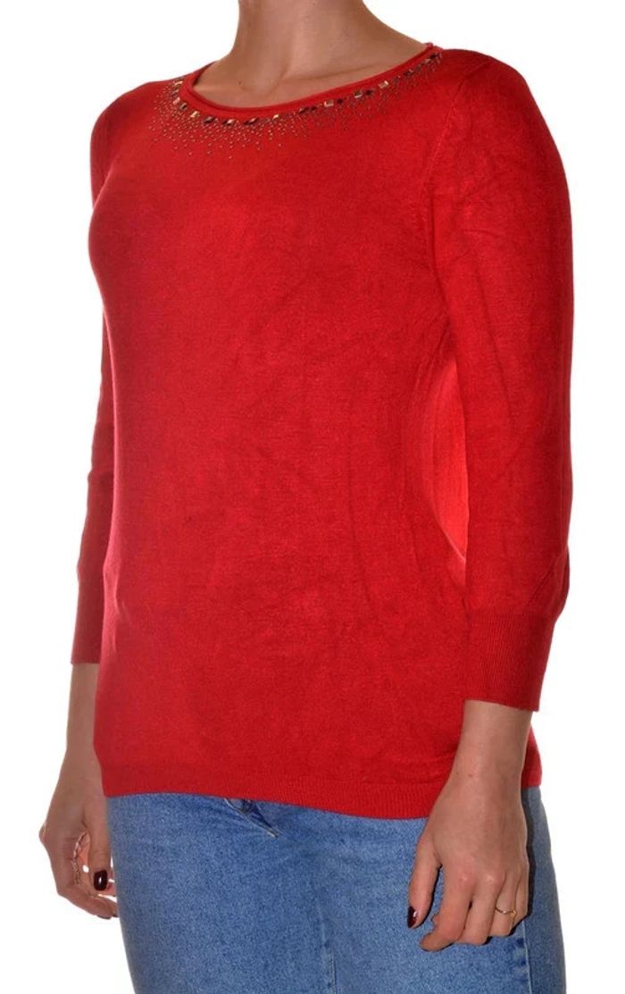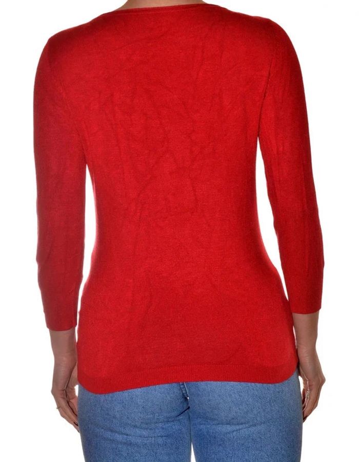 🌸manches longues 🌸joli détail au col rond 🌸rouge uni 🌸 pull fin, ajusté tissu élastiqué épaule à épaule sans étirer : 35,5 cm aisselle à aisselle 44 cm longueur 58 cm 81% viscose 17% polyamide 2% élasthanne