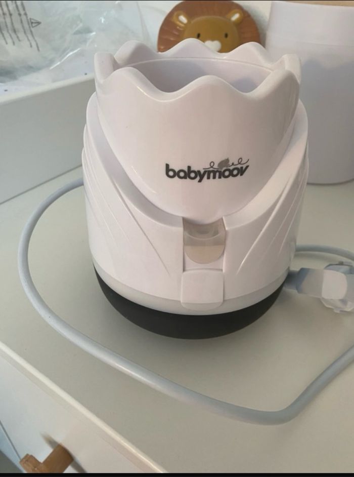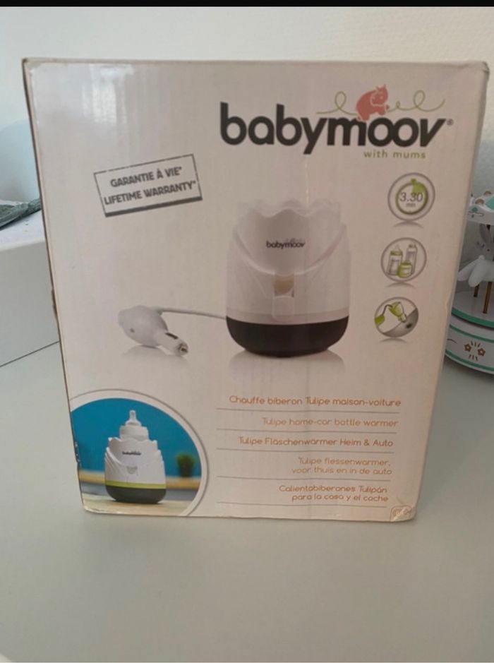 Chauffe biberon marque babymoov A été très peu utilisé Fourni avec dosette graduée Manque le petit panier et l’anneau d’adaptation ainsi que que la prise voiture ( CARTON Déchiré) Fourni avec notice