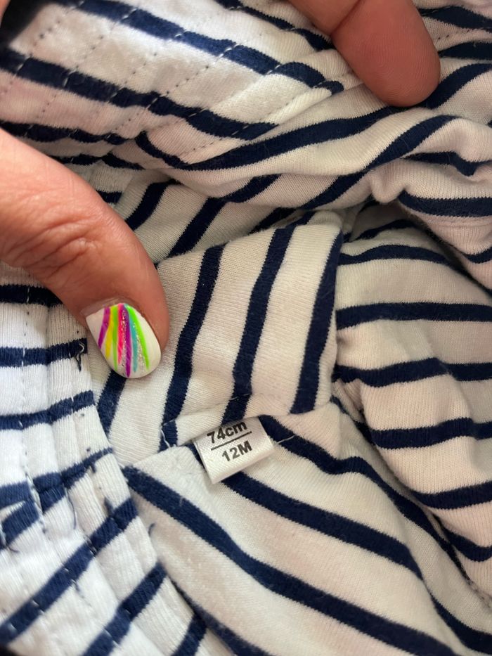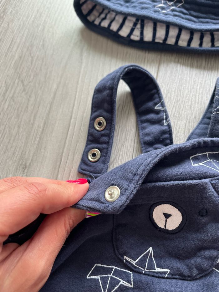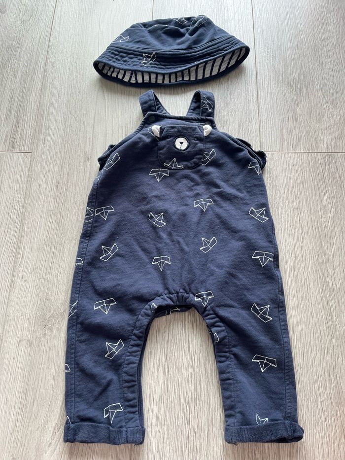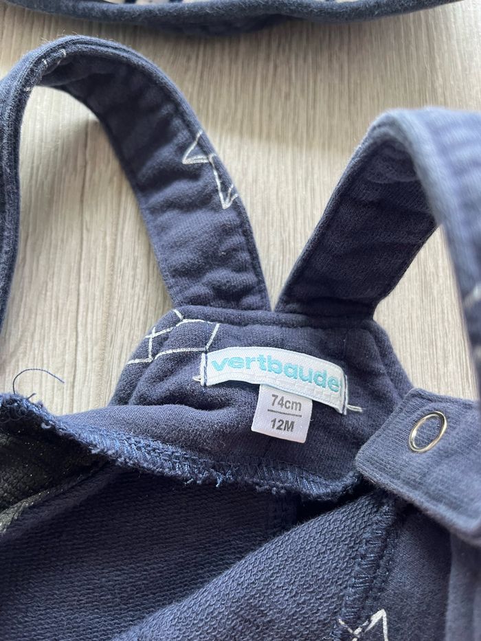 Ensemble bébé taille 12 mois, de chez Vertbaudet. Comprend une salopette et un chapeau. Entrejambe à boutons pressions pour faciliter l’habillage et le change. Porté une seule fois.