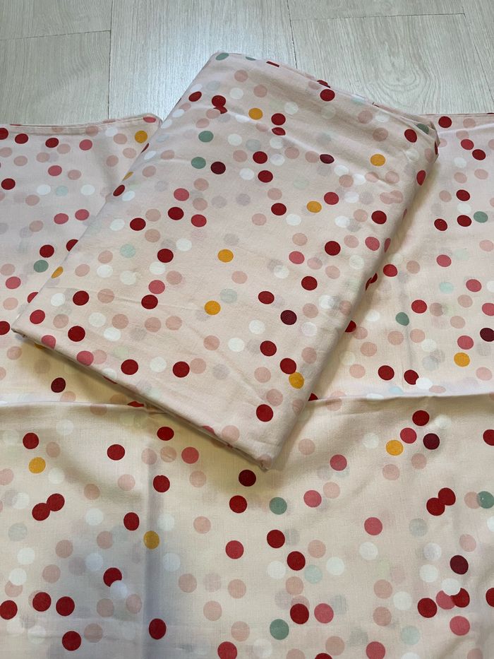 Vend parure de lit une place motif petite pois pour fille comprend une housse de couette et une taie d’oreiller en bon état
