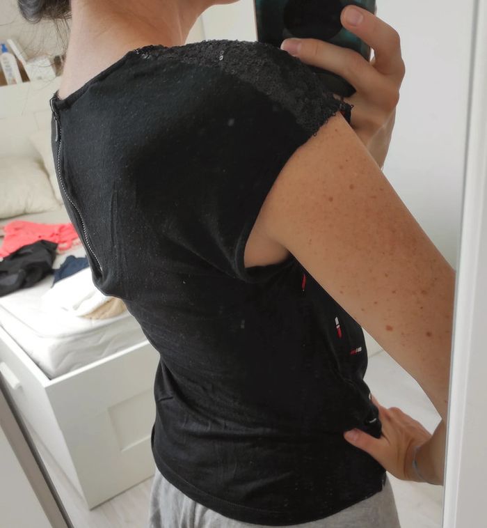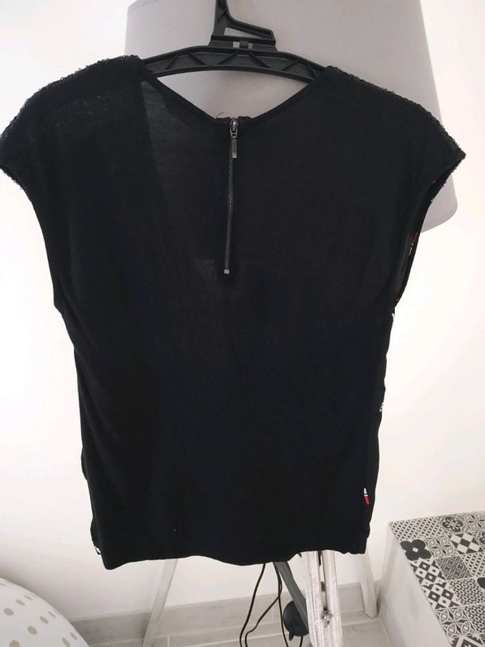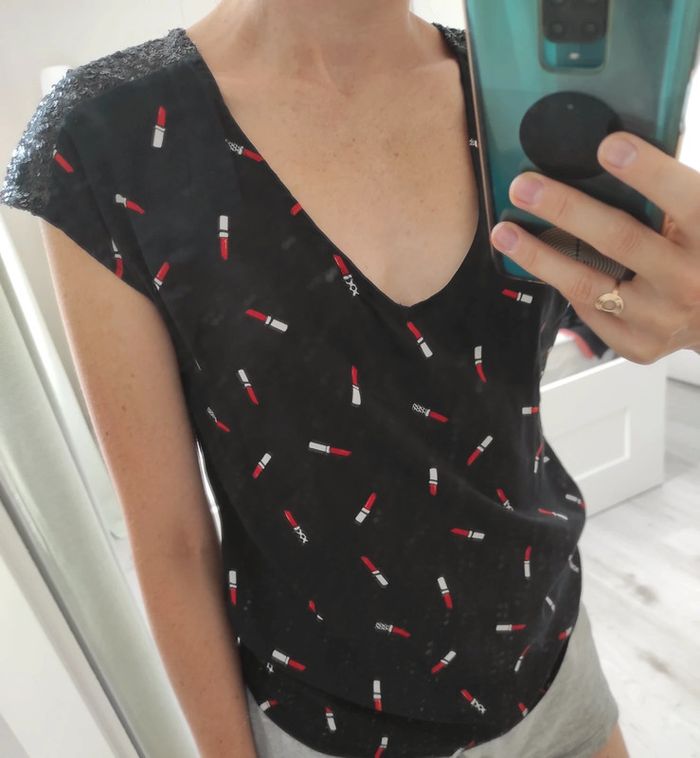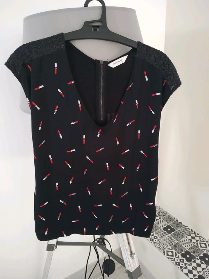 Top fluide NafNaf Noir avec motifs rouges à lèvres Sequins noir sur les épaules Décolleté en V et fermeture dans le haut du dos Très bon état #lolotte31Femme34XS