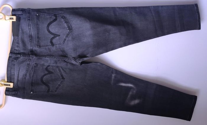 Pantalon / jean slim stretch noir, jamais porté. Une trace de décoloration d'origine à l'arrière (visible sur la photo). Longueur totale : 89.5 cm Largeur bas de jambes : 13 cm