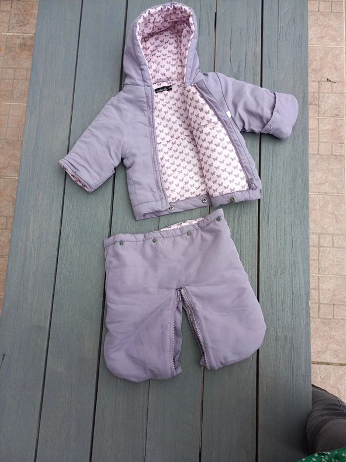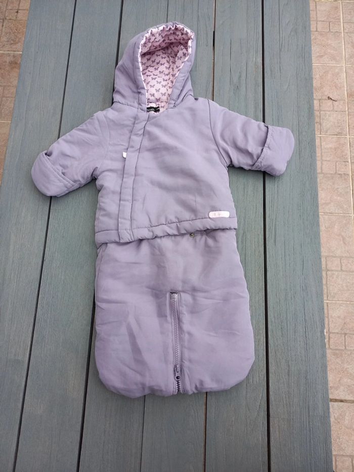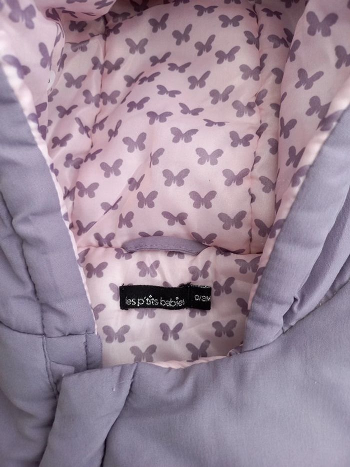 Chancelière couleur lilas et rose, marque Les P'tits baies en taille 0-3 mois, le haut et le bas sont détachables, le bout des manches peuvent être fermés ou ouverts. Très bon état.