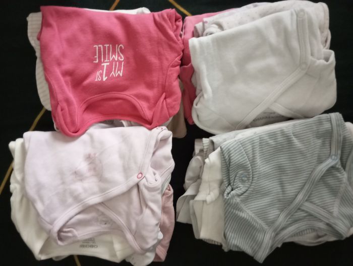 Bodys taille 1 mois vendu par lot ou à l'unité. Possibilité d'avoir d'autres photos. Ils sont en très bon état Le prix est indiqué pour un lot de 20 body
