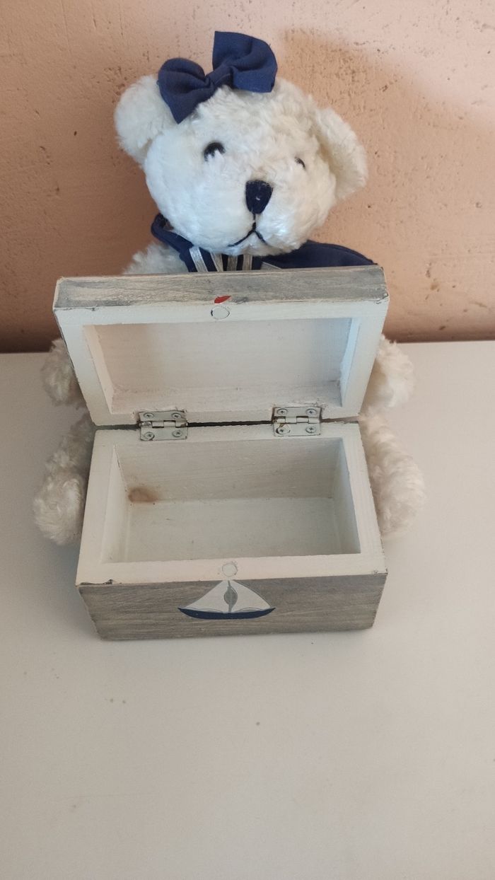 Bonjour Vend petite boite avec son ours Non dissociable Très bon état La boite fait 10x5x4