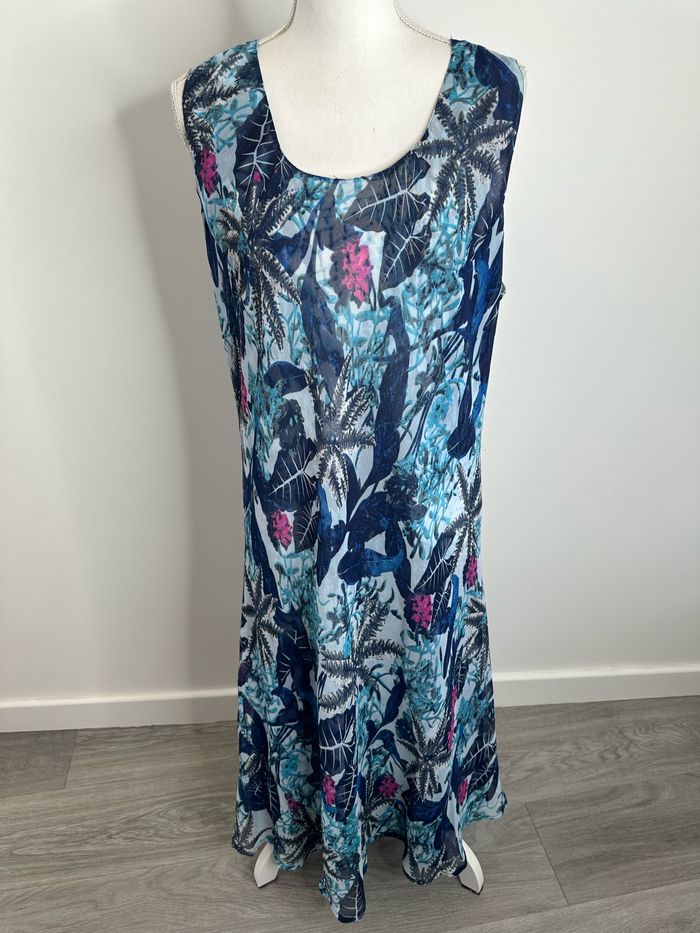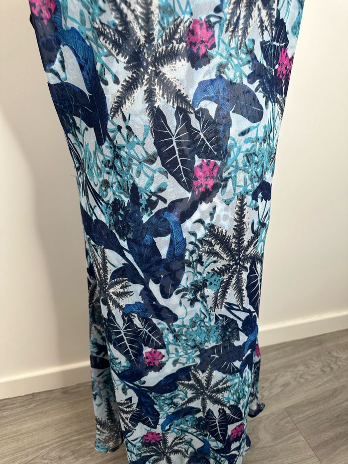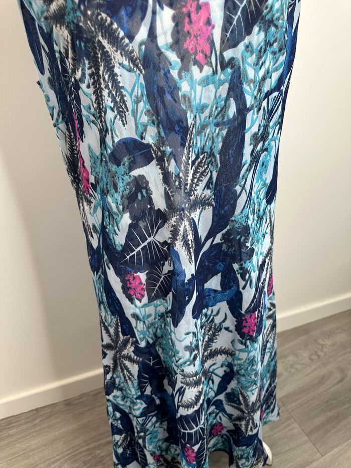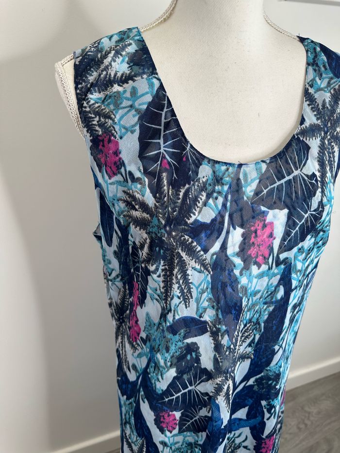 Robe longue - Excellent état - Taille 46/48 équivalent 3XL/4XL - Imprimés tropicaux, tropical - Bleue, bleue marine et rose fuchsia - Col rond - Doublure intérieure - Vintage, années 80’ - Plus d’étiquette de taille ni de matière Dimensions: - 66cm niveau aisselles - 120cm de long