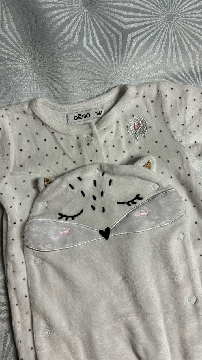 🤍Pyjama velours 🤍 🦊 Taille: 3 mois 🦊 Marque: Gémo 🦊 Couleurs: Blanc à pois noir et motif tête de renarde 🦊 Ouverture par l’avant, par boutons pressions