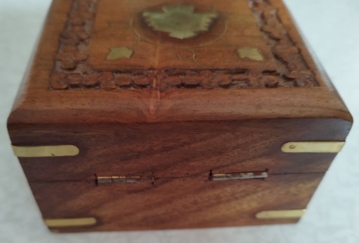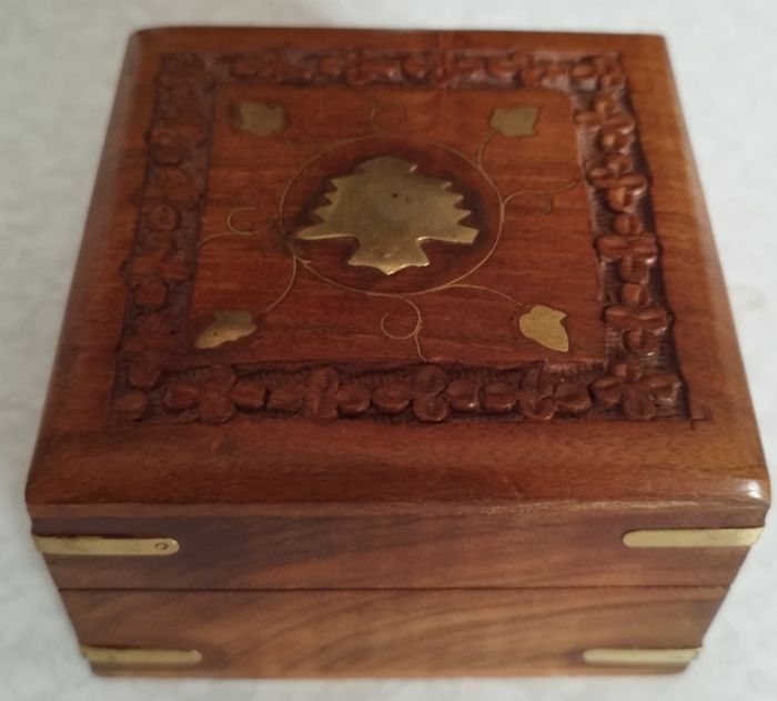 Boîte Mini à Bijoux en bois sculptée à la main avec incrustation unique sapin et feuilles en laiton Longueur: 10 cm Largeur: 10 cm Hauteur: 6 cm