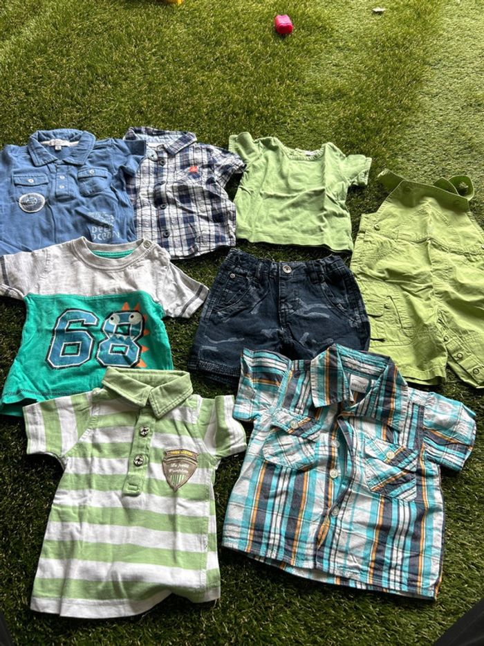 Lot de 8 vêtements en 6 mois comprenant: 2 chemises, 2 polos, 2 tee shirts 1 salopette et 1. Short. Différentes marques: influx, cadet Rousselle, tape à l’œil, alphabet, Early dans, DPAM, IDO et Sergent major.