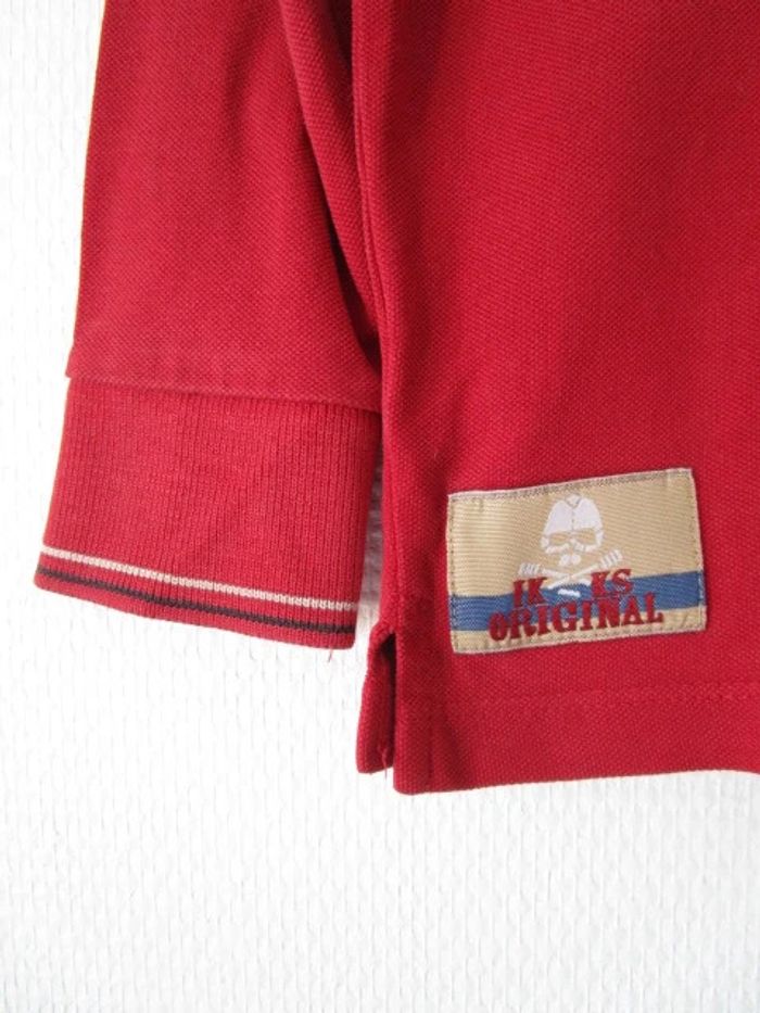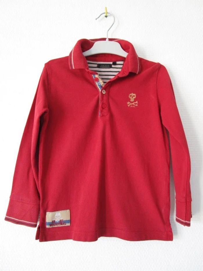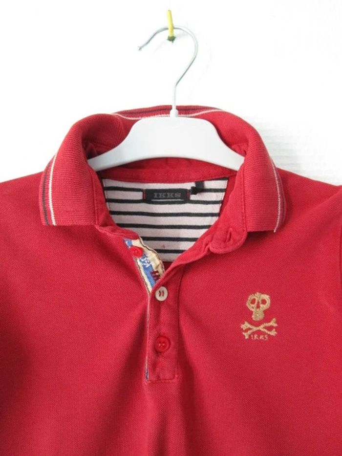 Polo rouge brique de marque IKKS taille 4 ans Manches longues Tête de mort brodée à gauche de la poitrine Bandes noires et beiges sur les poignets et le bord du col Revers du col écossais 100% coton En très bon état #mamanbrade59garçon4ans