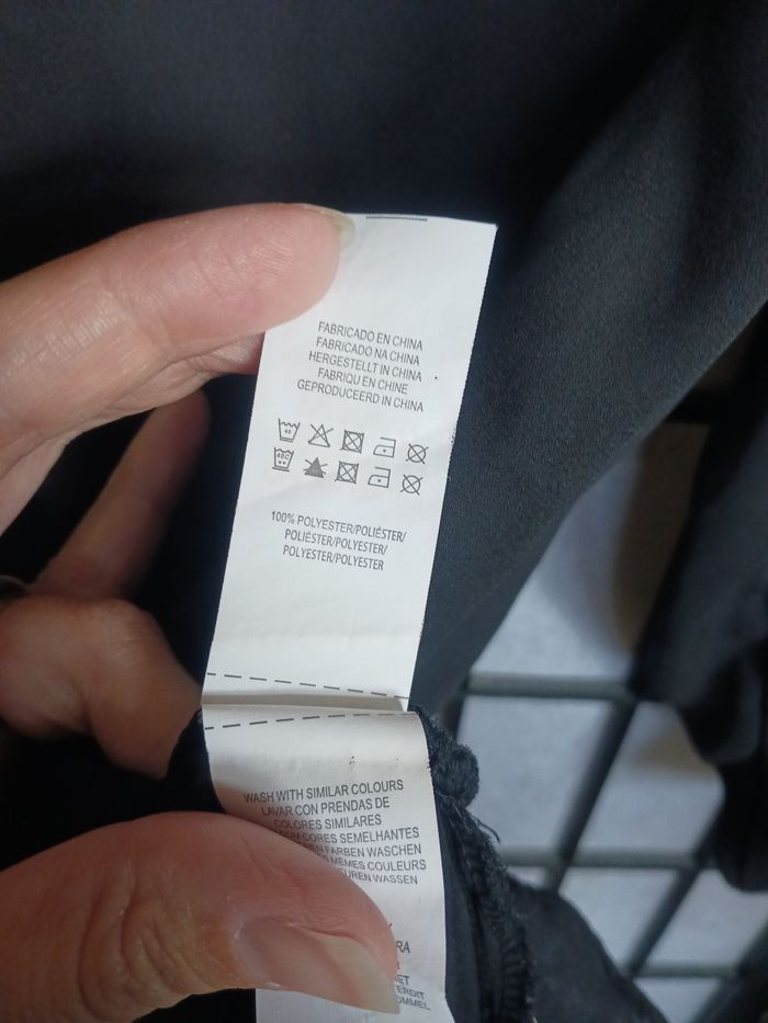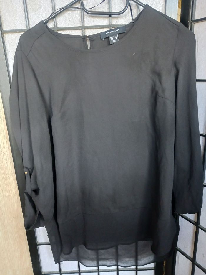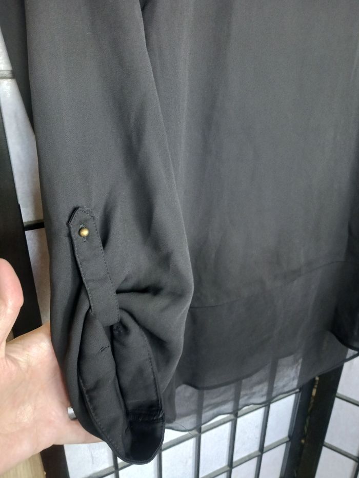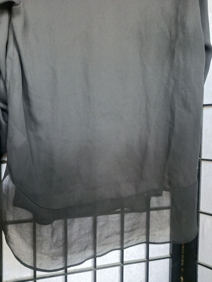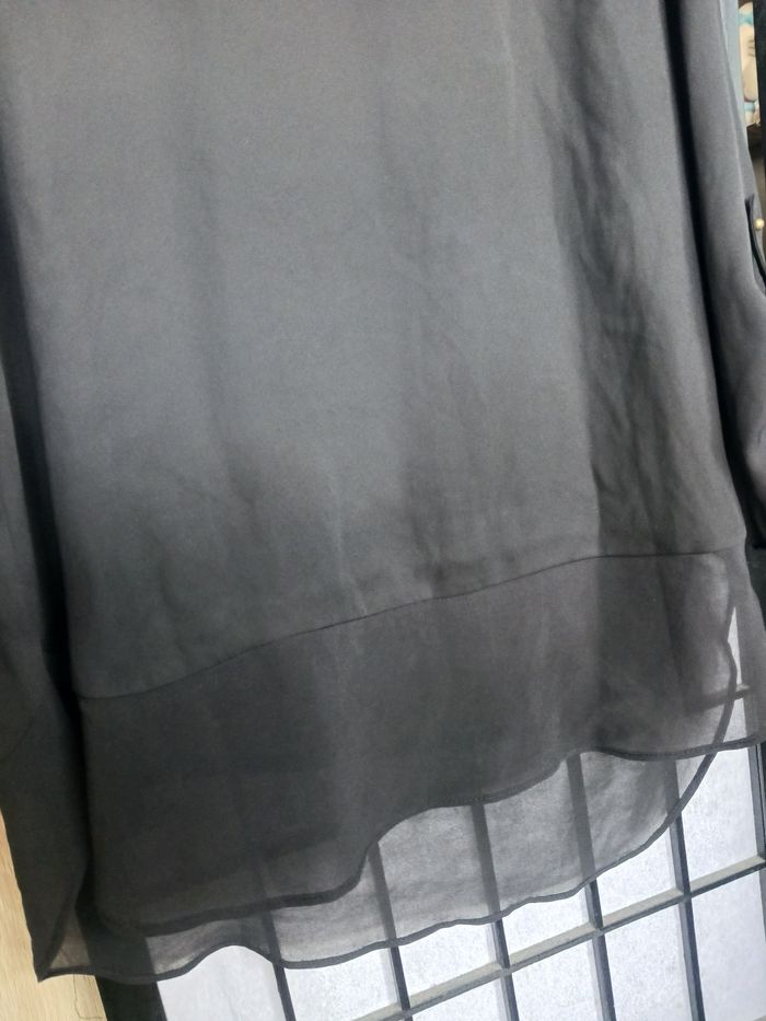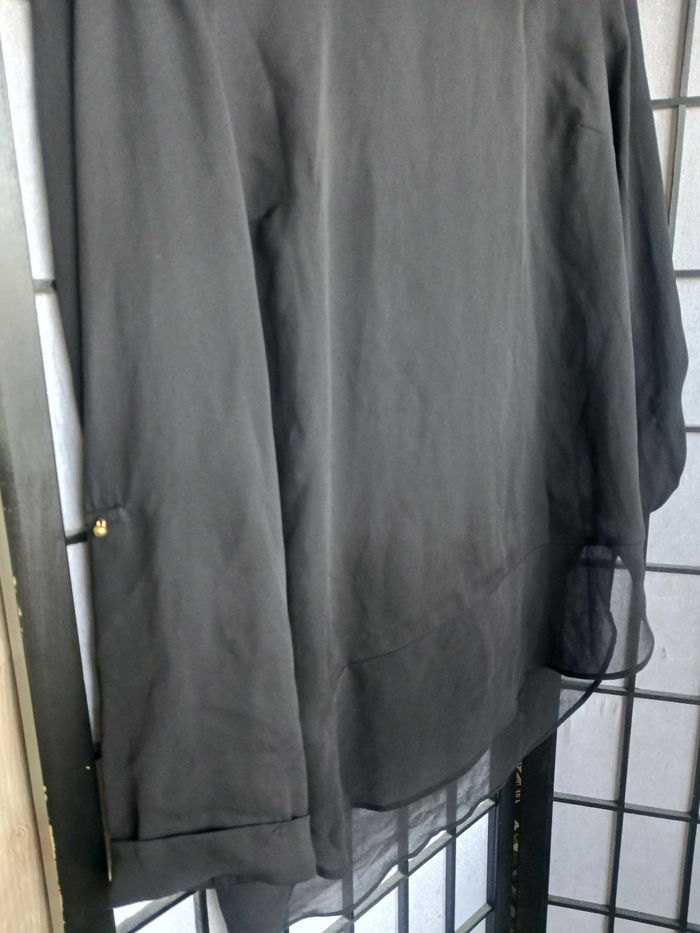 Blouse noir manche 3/4, plus long derrière, très très légèrement transparente. En bon état général