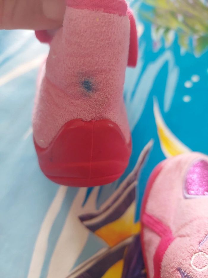 OFFERT pour autre article acheté Chausson très portés. Bon état. Peu encore servir . Petite tache et tissu intérieur semelle parti et décollé..VOIR photo.