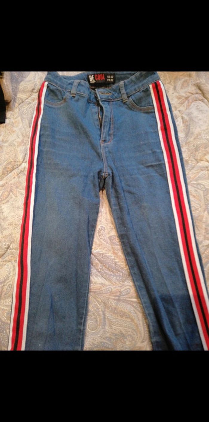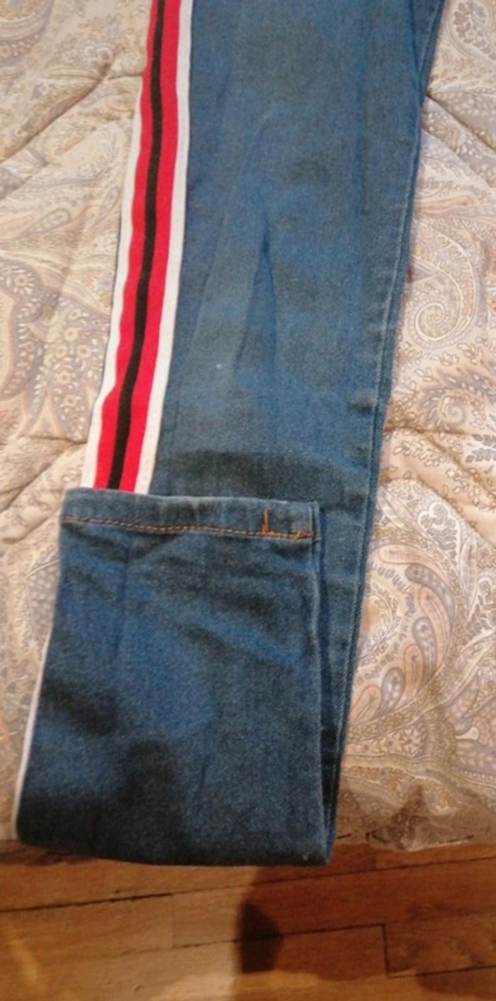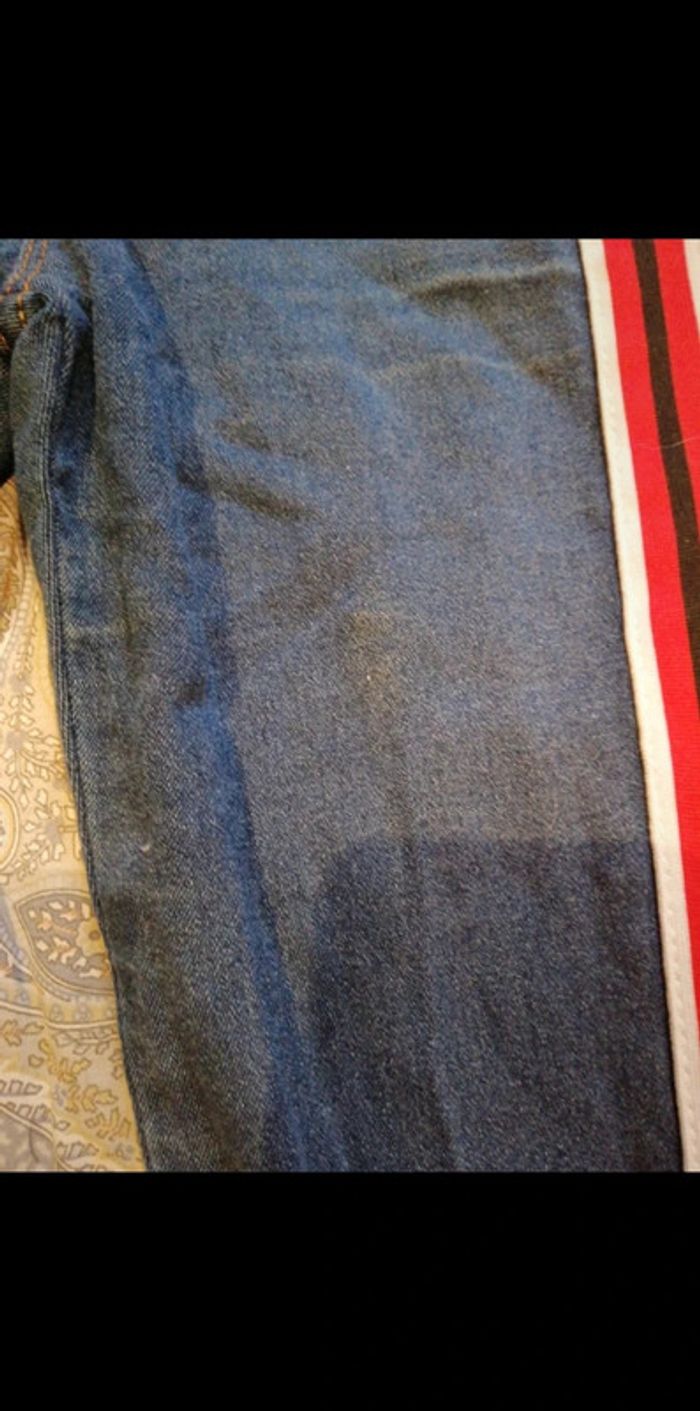 Jeans avec ses bandes sur le côté. Bon etat general. Porté plusieurs fois. Une petite tache sur la jambes (voir photo) peut vivre une autre utilisation.