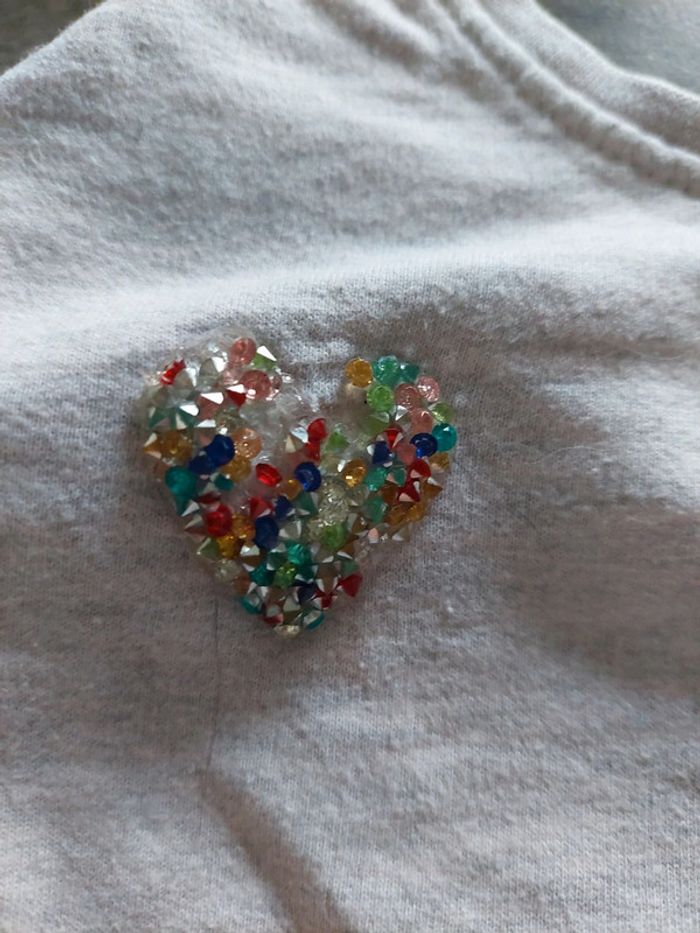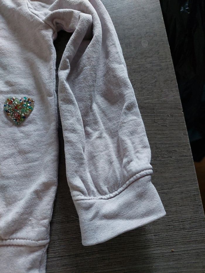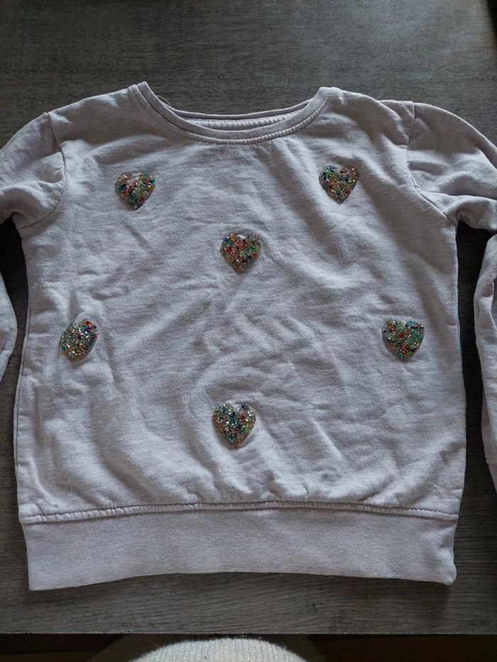 Pull avec ses coeur paillettes. Encore en bon etat. Bien porté. Manque quelques paillettes et on dirai 1 auréolé sur le col, mais ne gene en rien.