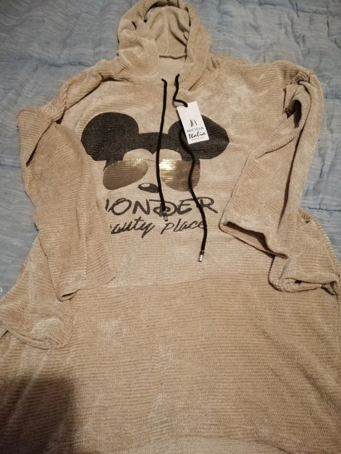 Pull leger a capuche motif mickey. Très bon état. Jamais porte. J'ai coincé l'étiquette avec le cordon car je pensais le garder mais une fois essayé plus envie.