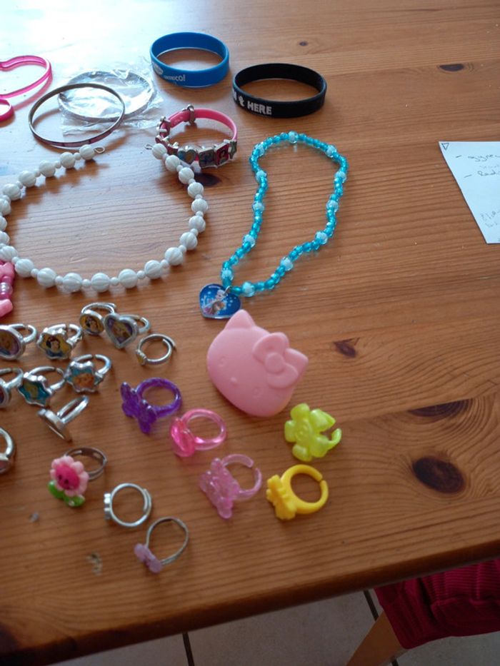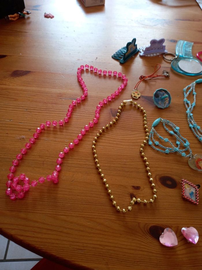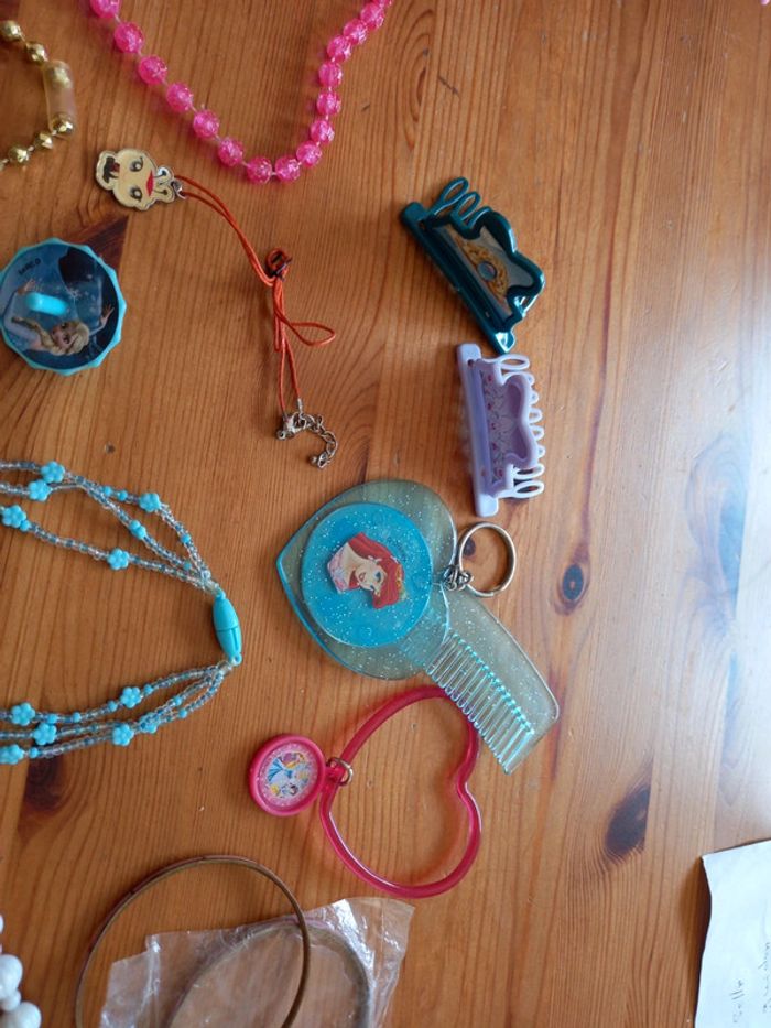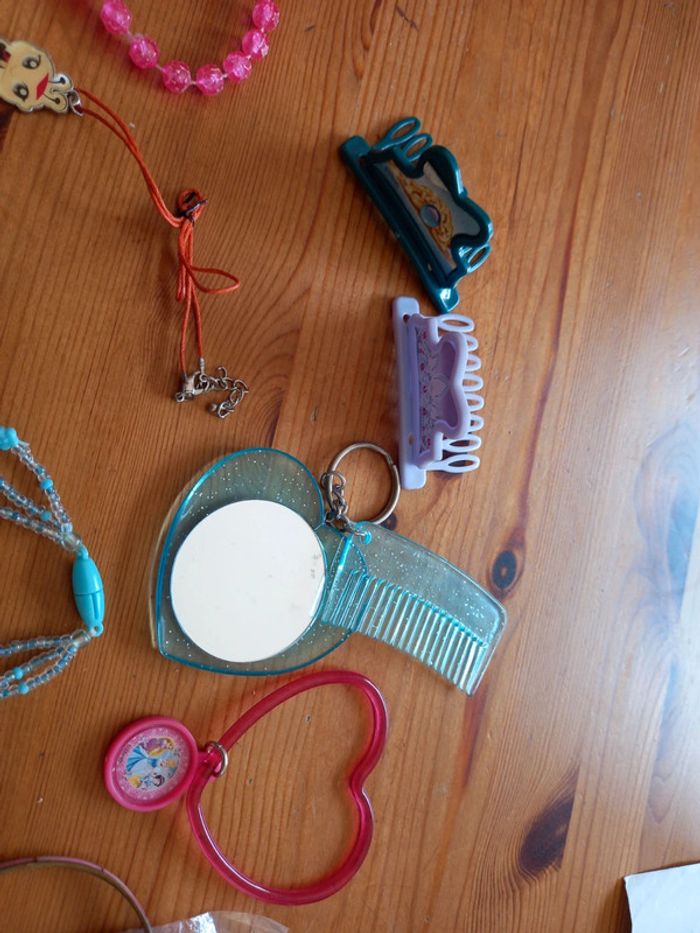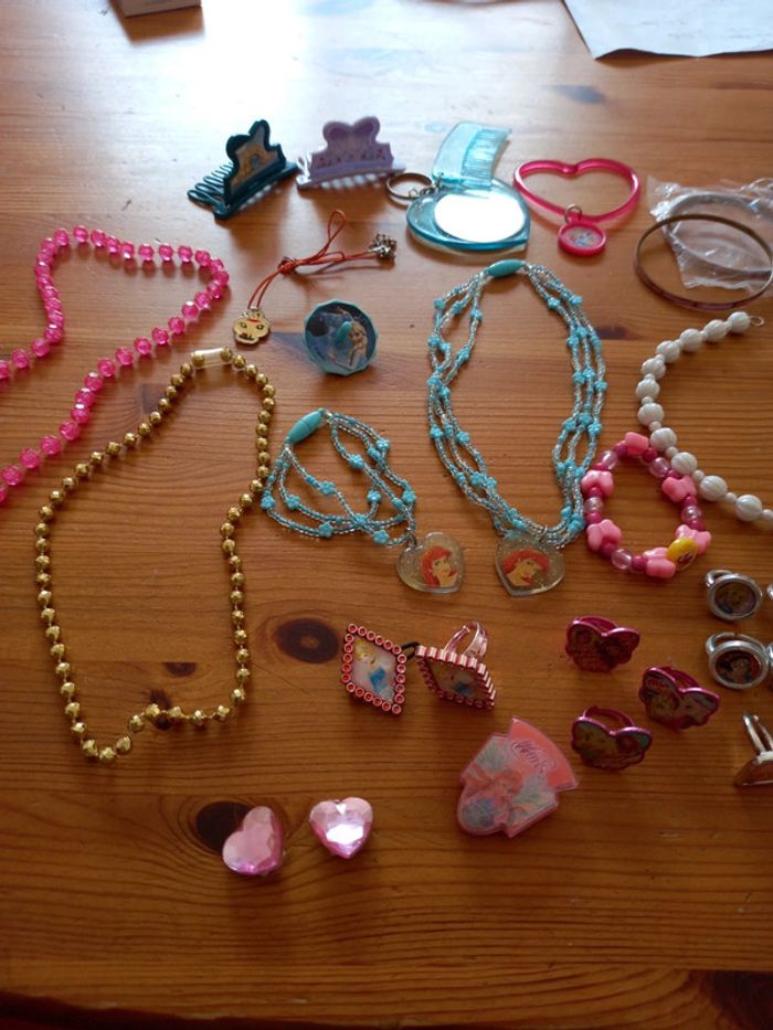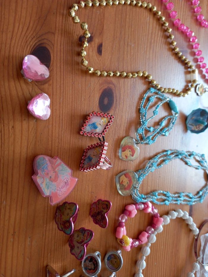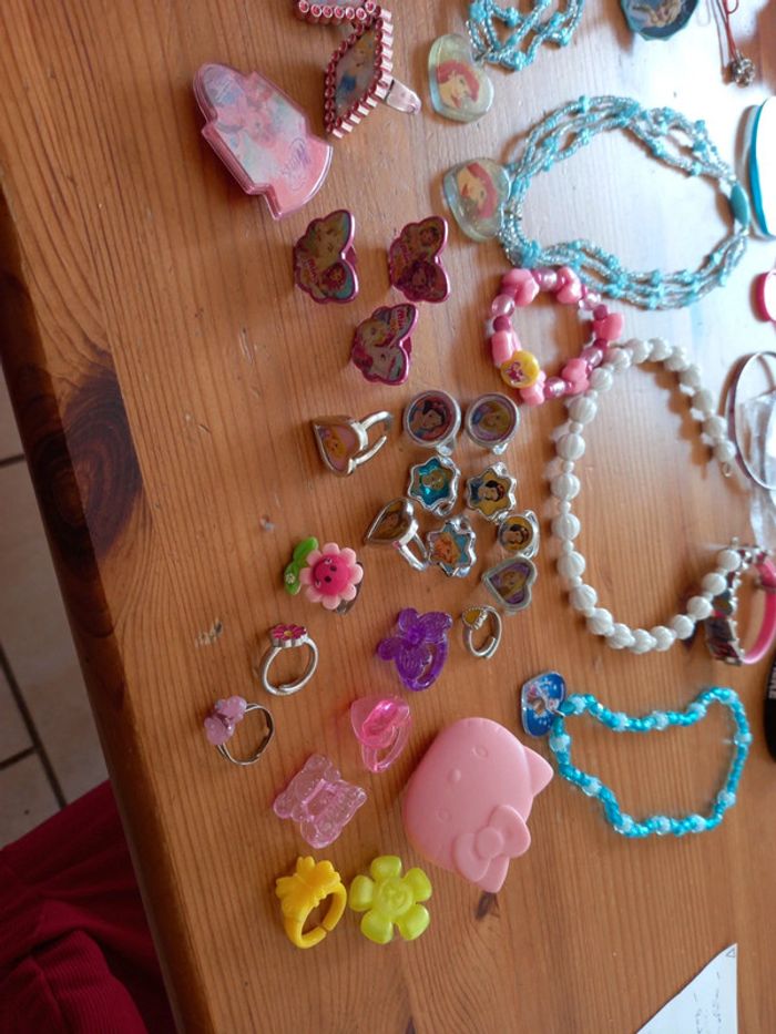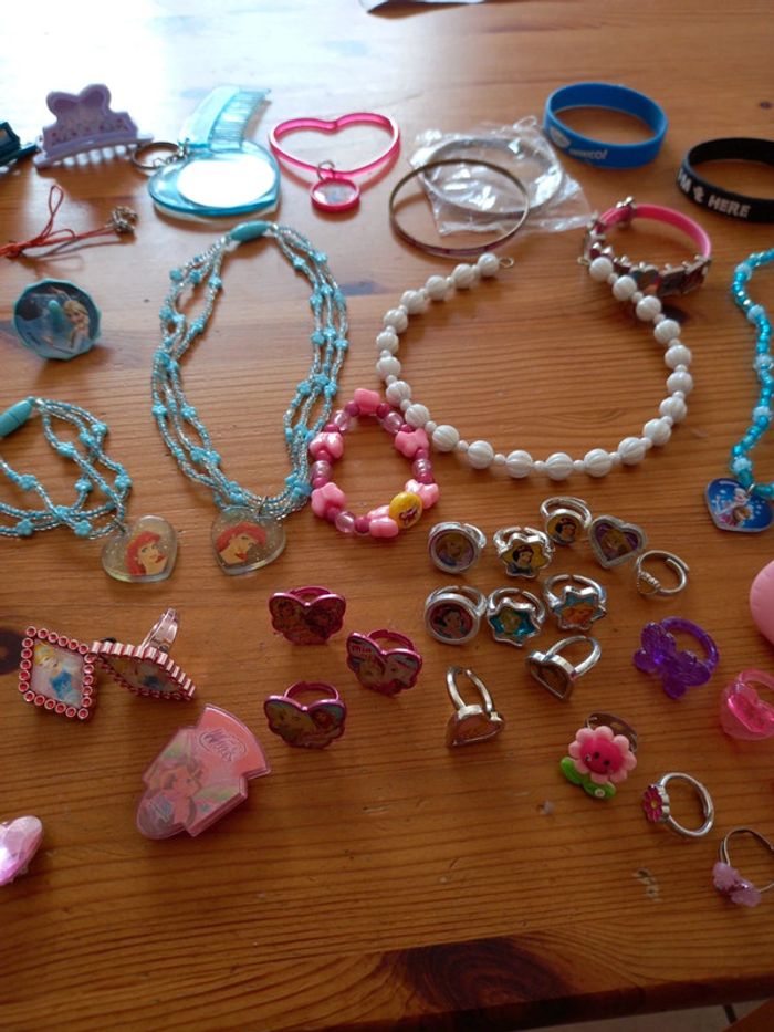 Lot de 44 bijoux disney et autre pour enfants : 23 bagues 8 Bracelets 6 colliers 1 paire de boucles d'oreilles 1 badge 1 pince 1 toupie 2 pinces peignes couronne 1 peigne avec un miroir Une petite fille qui sera contente, ou idéal pour une tombola ou pêche à la ligne.