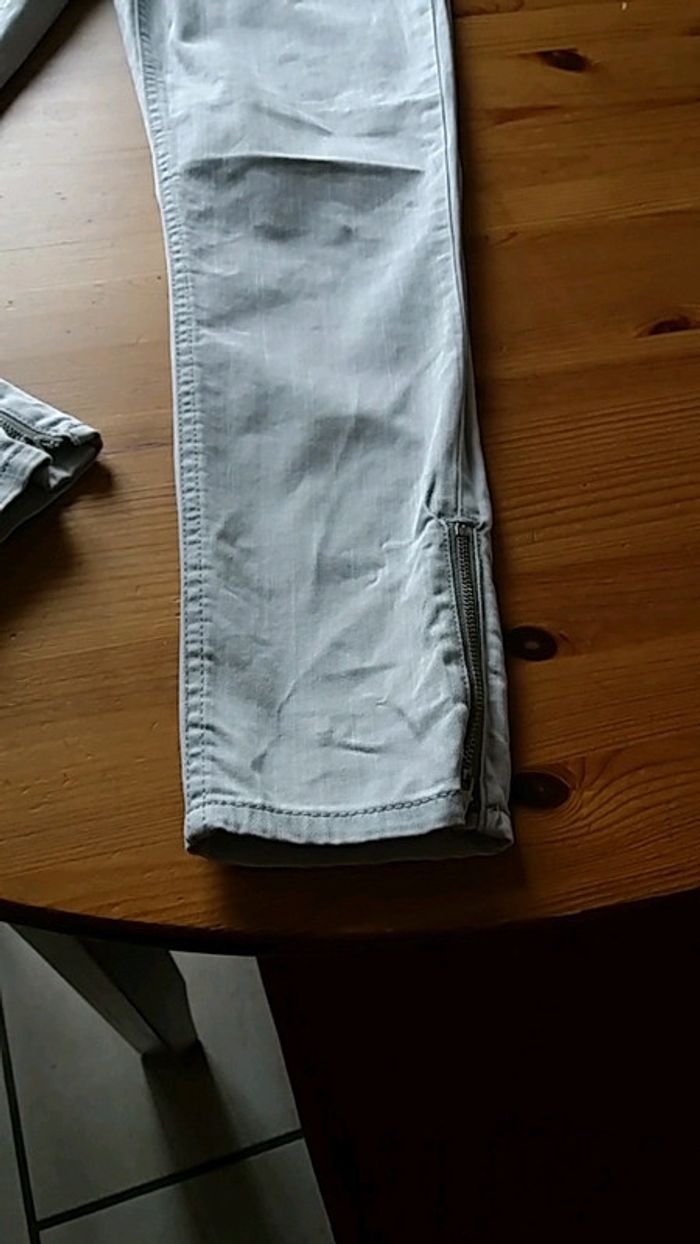 Jeans gris clair. 2 poches devant. 2 poches arrière. Fermeture en bas du pantalon (voire photos) Possibilité de resserré le pantalon avec l'élastique à l'intérieur.