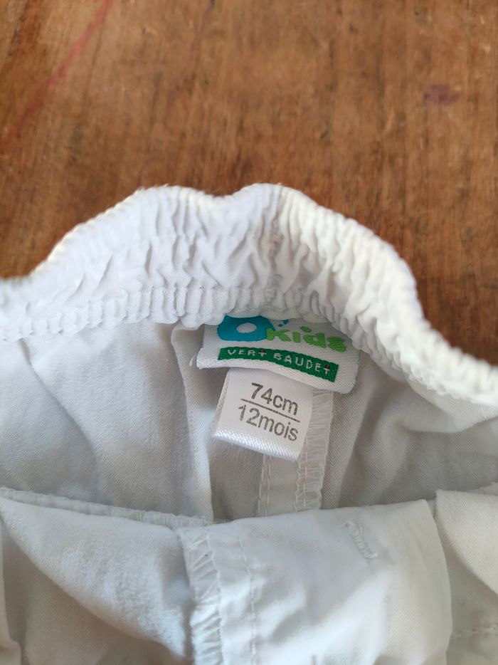 Petit défaut sur le bouton du short blanc (cf photo). Taille 12 mois. Bon état.
