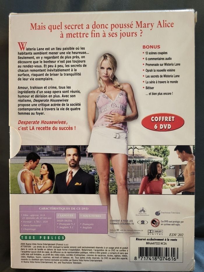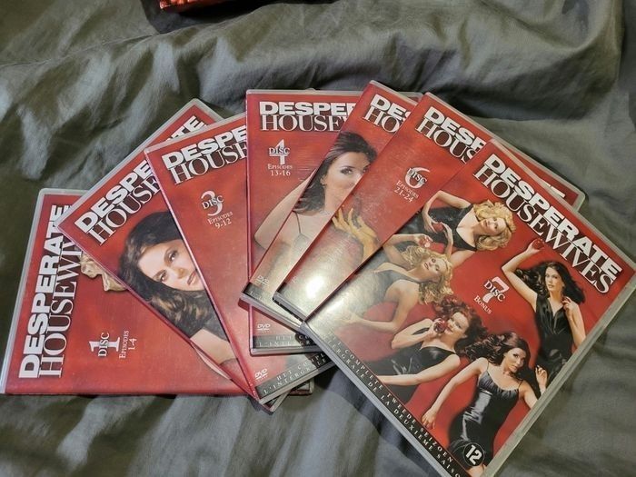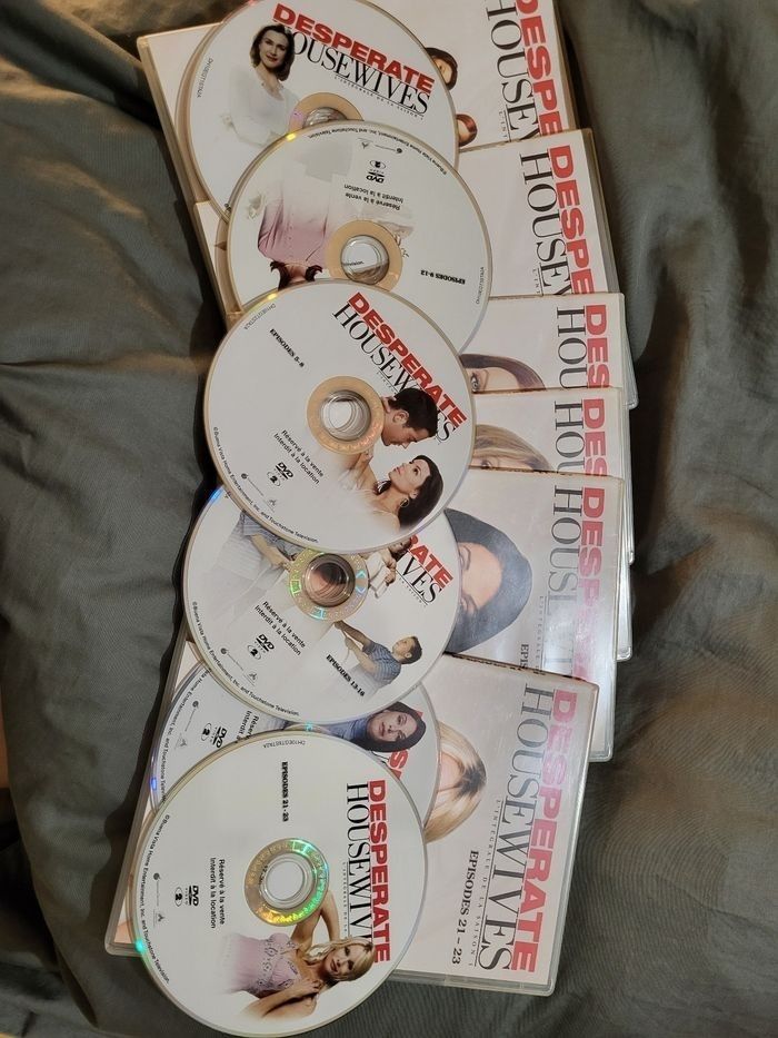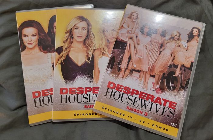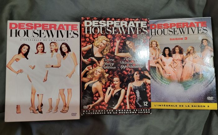 Desperate Housewives L'intégrale Saison 1, 2 et 3 Coffret de 6 DVD pour saison 1 et 7 DVD pour saison 2 Boites légèrement rayé et abîmé ds les angles Pour la saison 3 il y a du scotch transparent sur tout le tour de la boîte et étiquette blanche arraché au dos