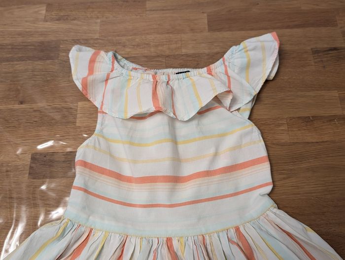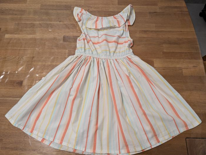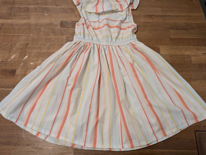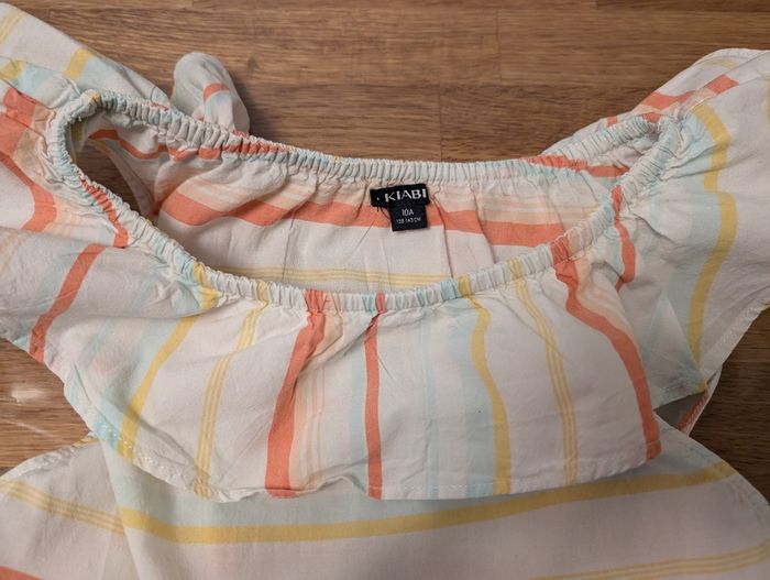 Robe fille 10 ans Kiabi Bon état, plutôt printemps été, blanc, saumon, jaune, bleu très clair, étiquette intérieure coupée. Un point à l'arrière et un petit trou à l'arrière également. Voir photos