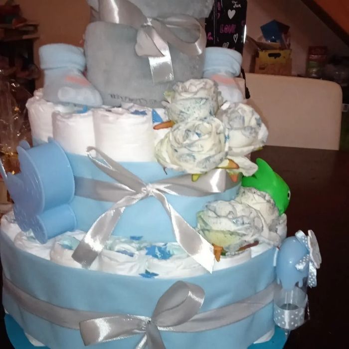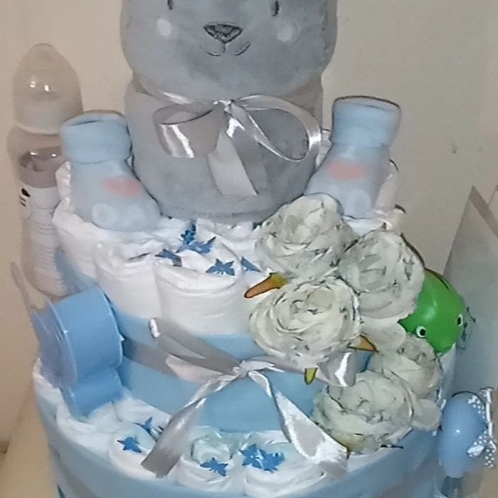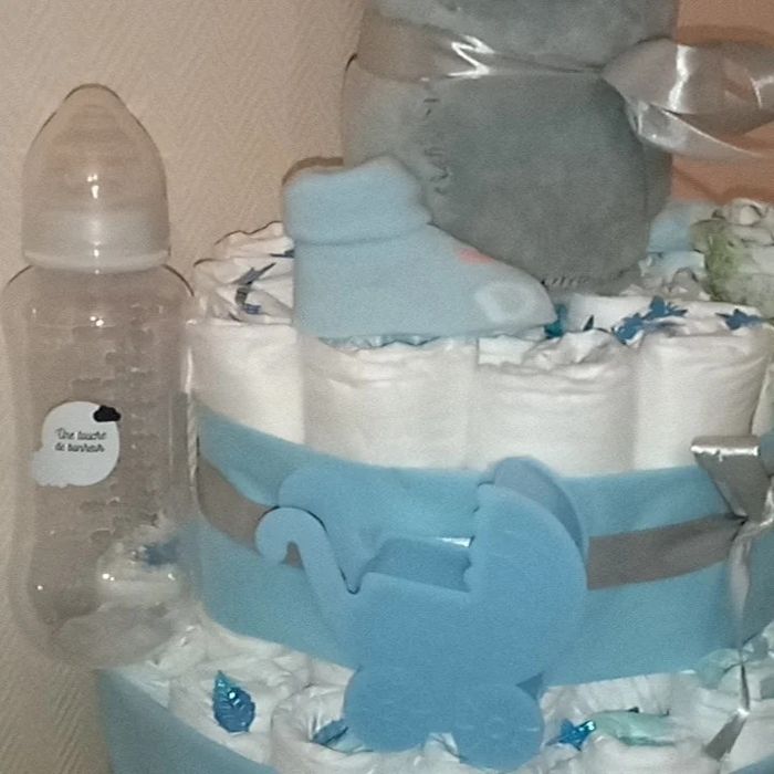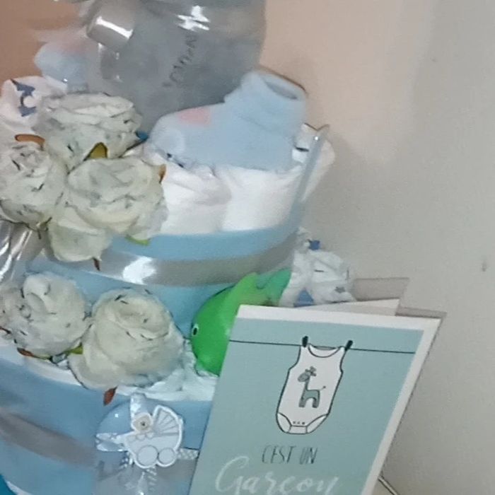 Gateaux de couche (garçons) Gateaux comprenant : *50 couches *Couverture *Chaussettes *Jouet de bain *Peigne *Cuillère *Carte naissance (à offrir) *un biberon