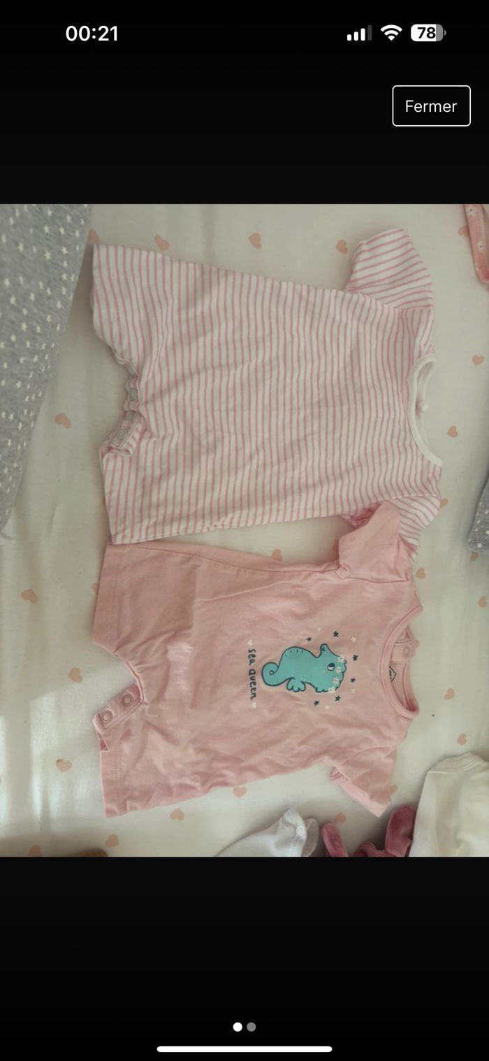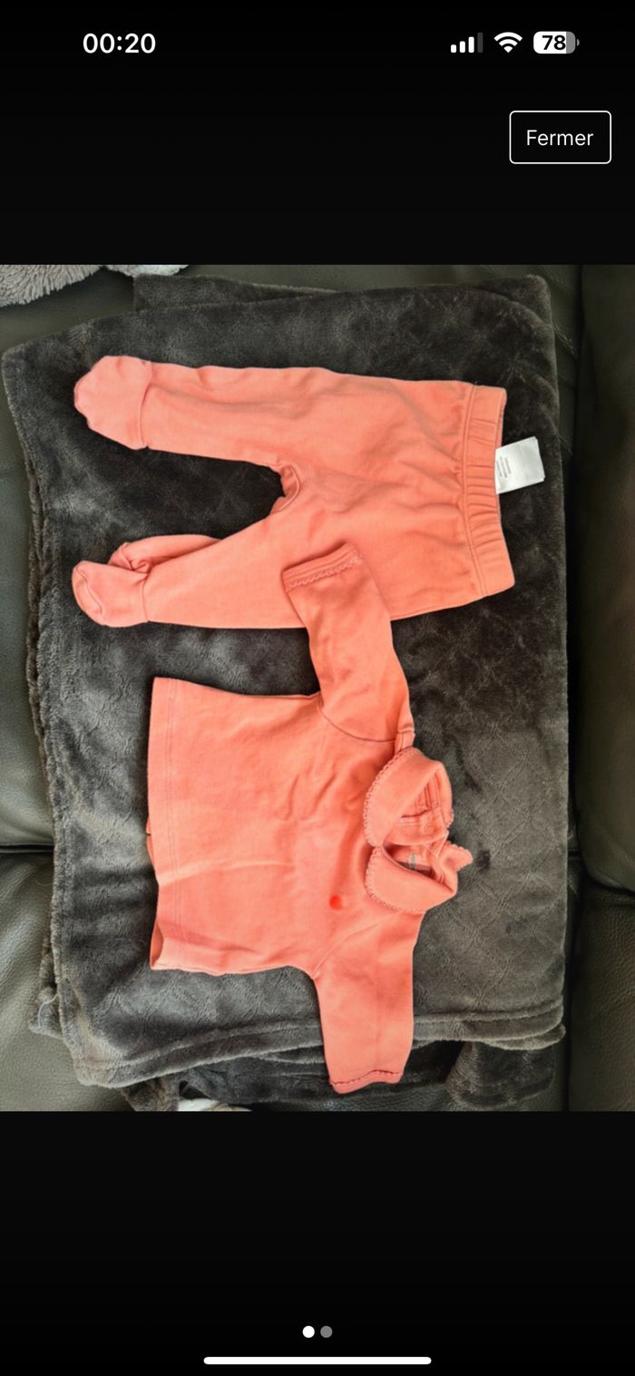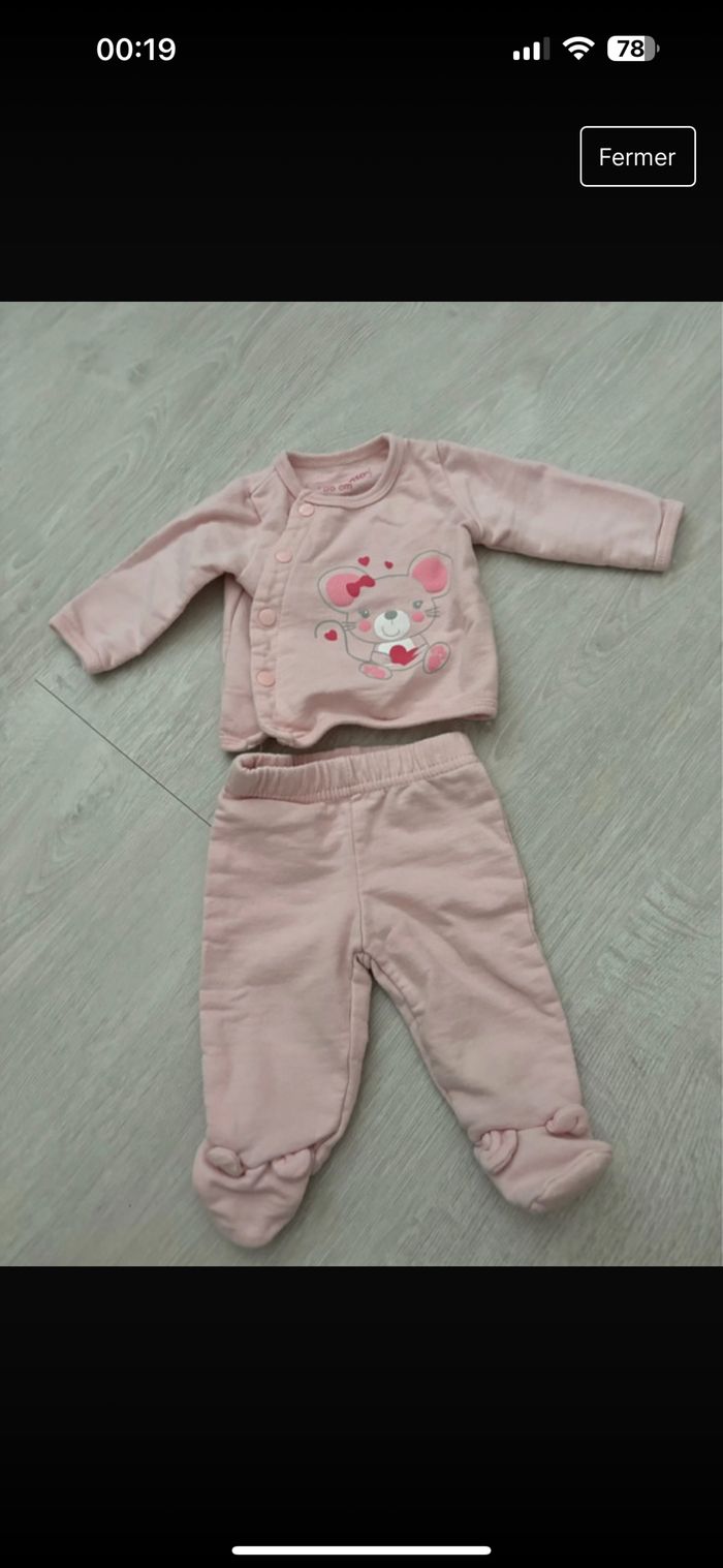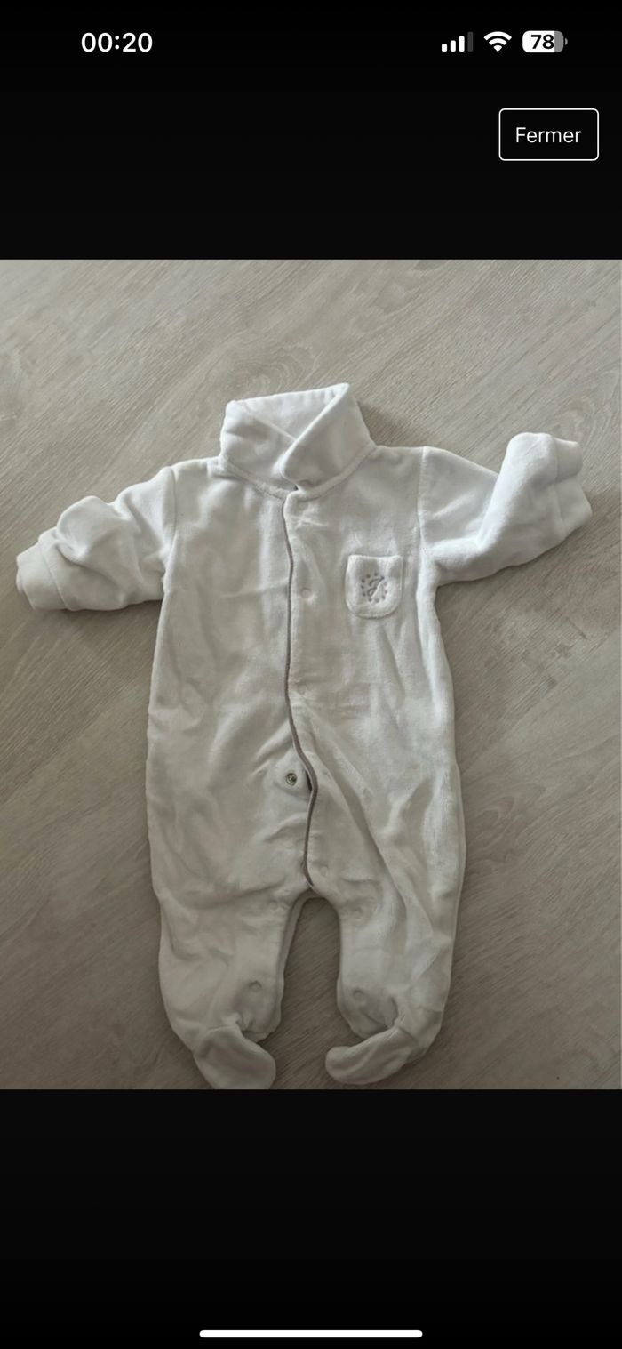 Lot de vêtements naissance et 1 mois comprend : Autres photos à la demande - 3 combi short 1 mois - 4 ensemble 1 mois - 1 gilet 1 mois - 7 body manche courte 1 mois - 2 body manche longue naissance - 1 pyjama fin naissance - 1 salopette 1 mois - 2 pyjama velour naissance - 4 leggings naissance - 1 ensemble veste et legging naissance - 1 veste naissance - 2 ensemble haut + culotte 1 mois - 3 body manche courte naissance - 1 veste moumoute à capuche 1 mois