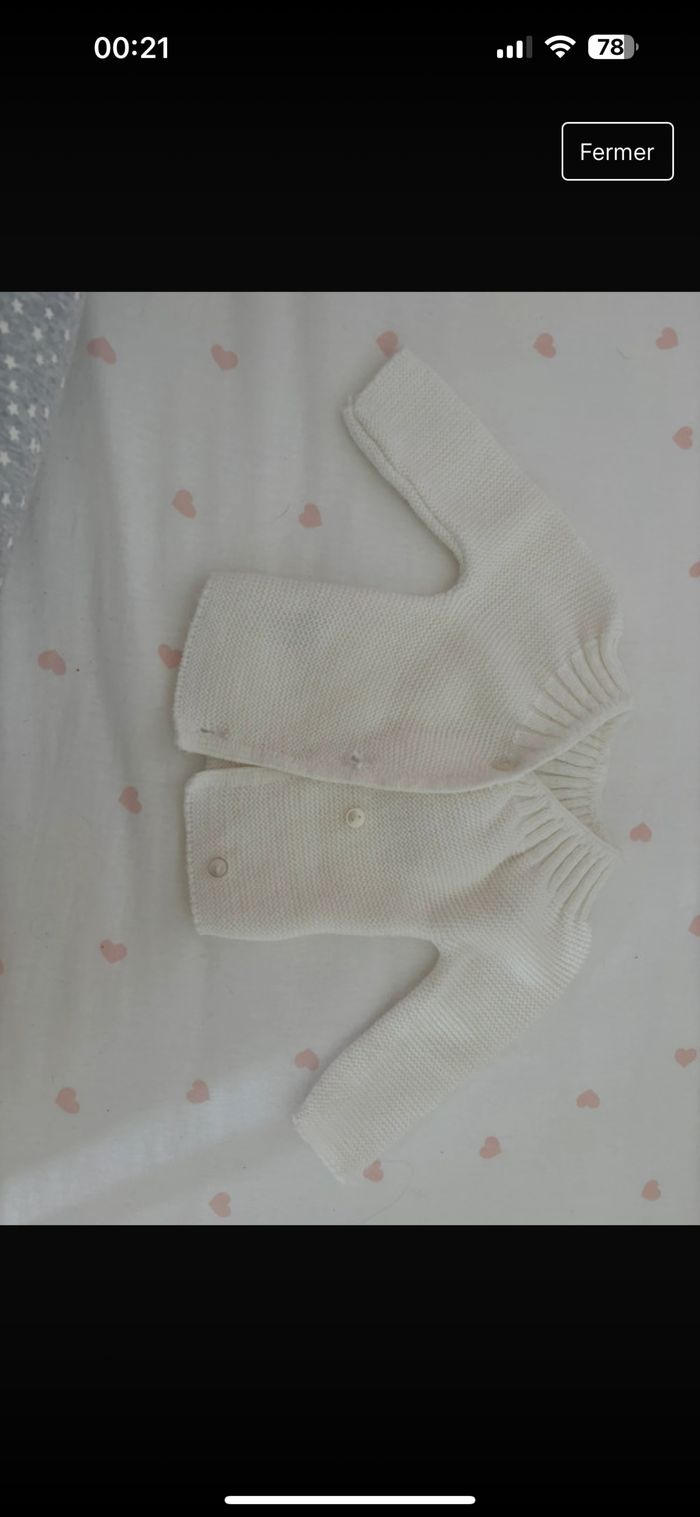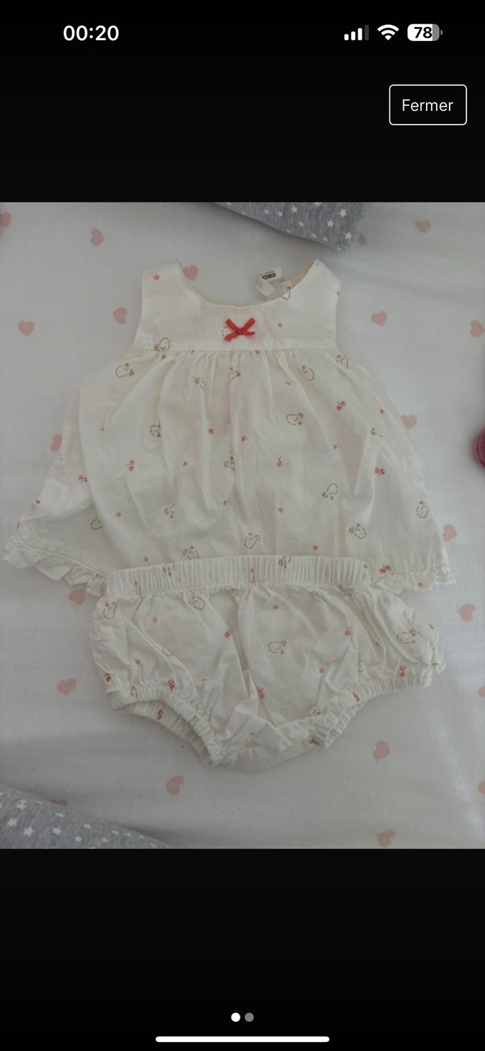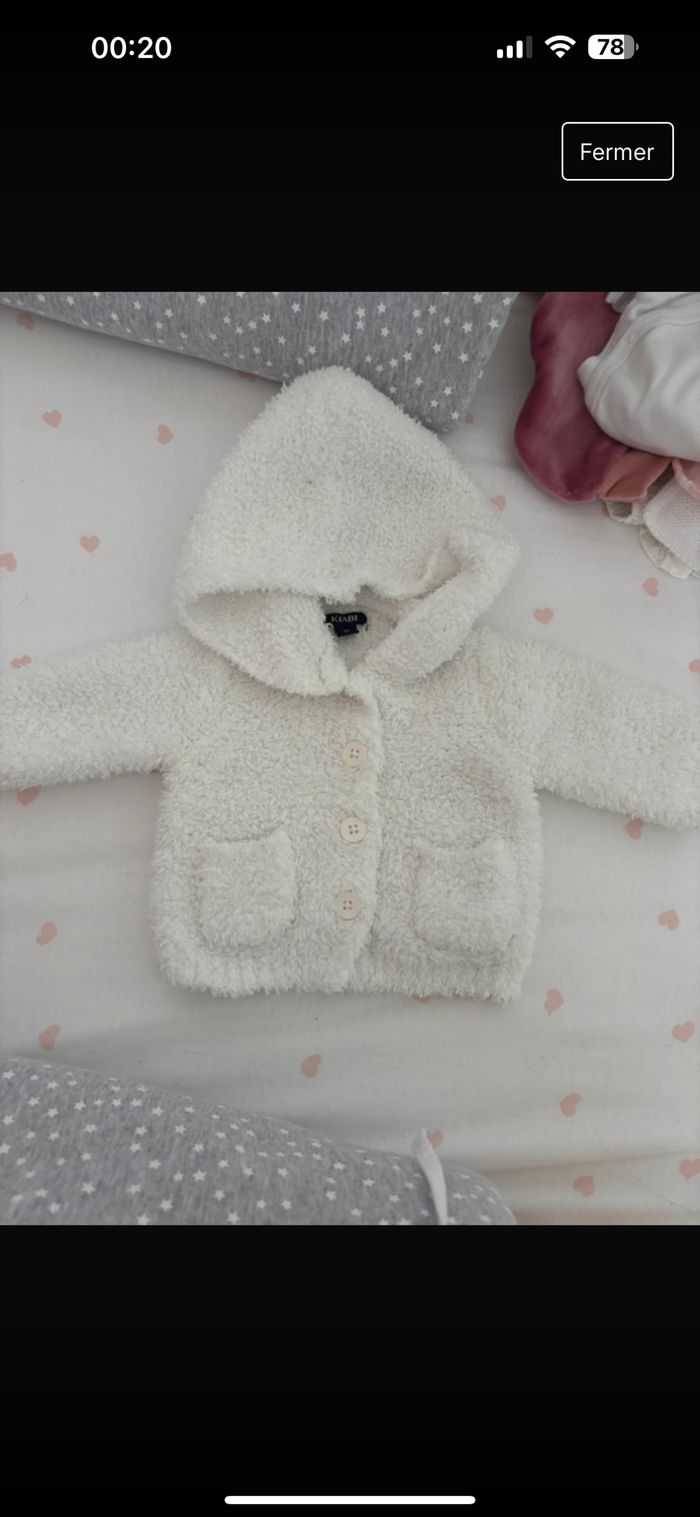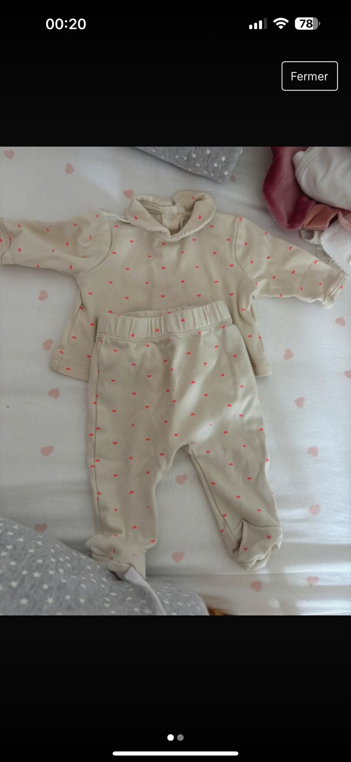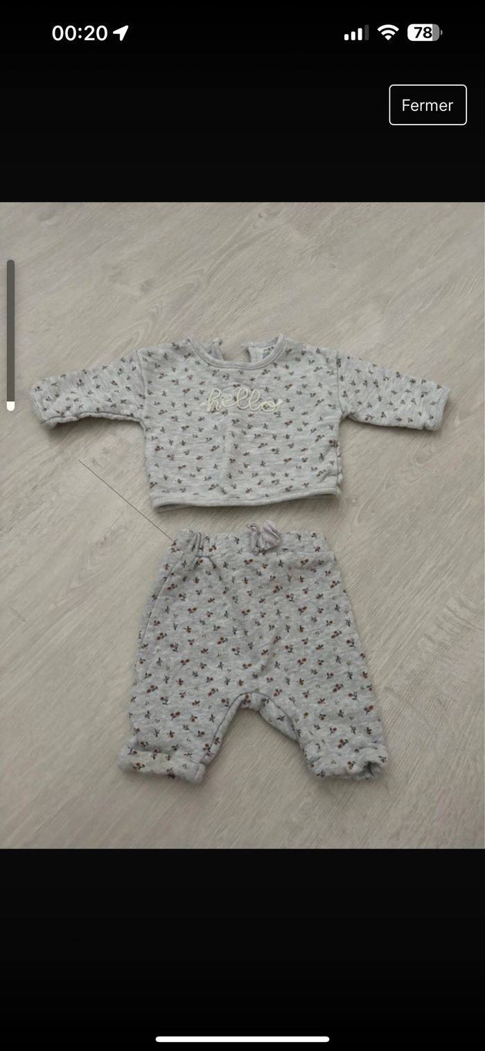 Lot de vêtements naissance et 1 mois comprend : Autres photos à la demande - 3 combi short 1 mois - 4 ensemble 1 mois - 1 gilet 1 mois - 7 body manche courte 1 mois - 2 body manche longue naissance - 1 pyjama fin naissance - 1 salopette 1 mois - 2 pyjama velour naissance - 4 leggings naissance - 1 ensemble veste et legging naissance - 1 veste naissance - 2 ensemble haut + culotte 1 mois - 3 body manche courte naissance - 1 veste moumoute à capuche 1 mois