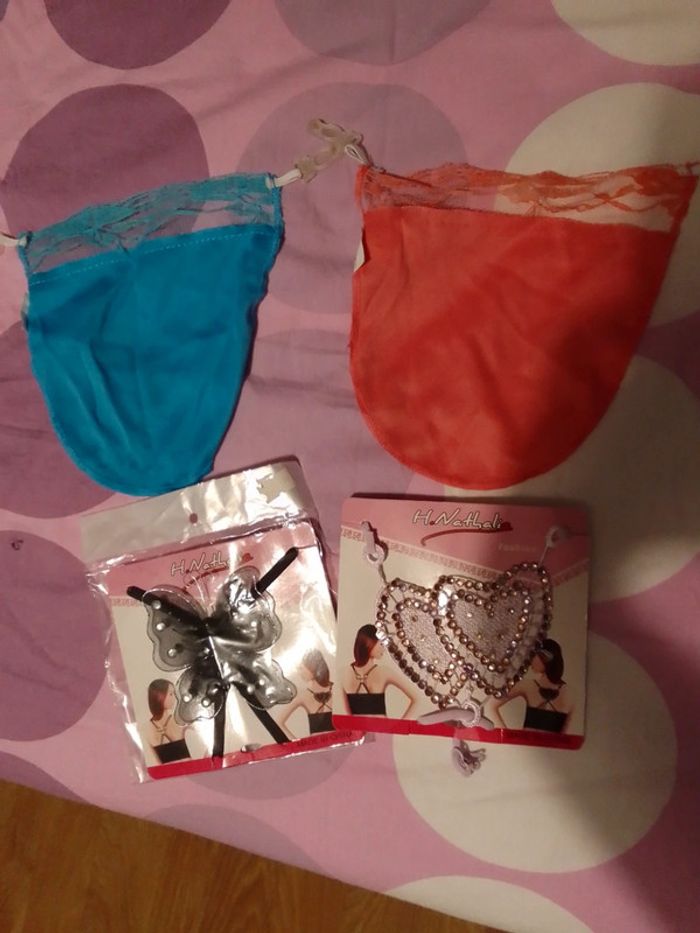 Lot accessoires neuf : - 2 cachés décolleté avec dentelle 1 bleu et 1 orange - 2 attaches débardeurs très jolie 1 coeurs mauve et l'autre papillon noir . 🌸 Pensez au lot
