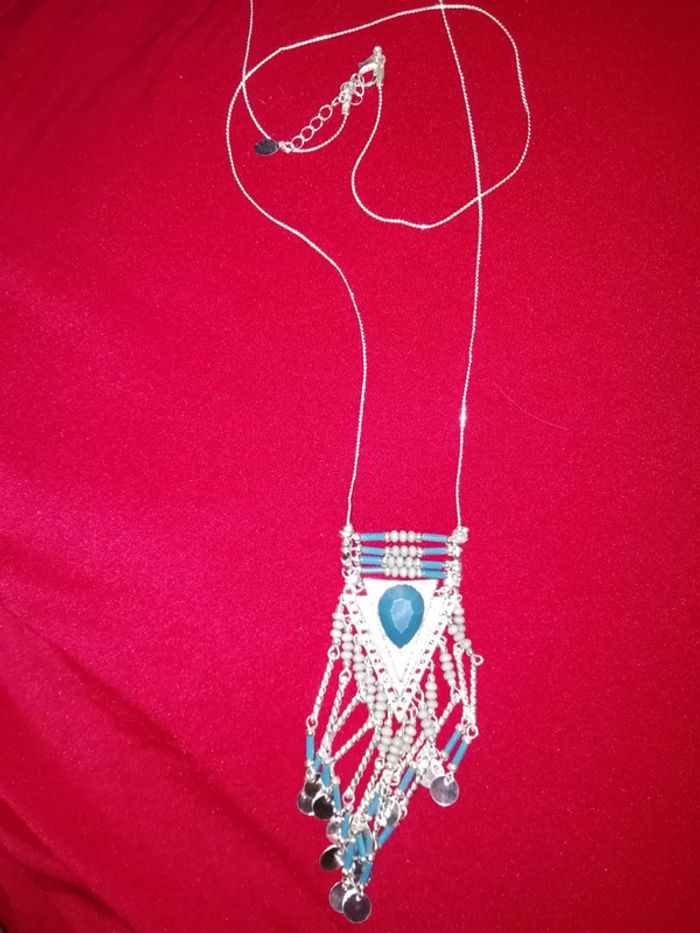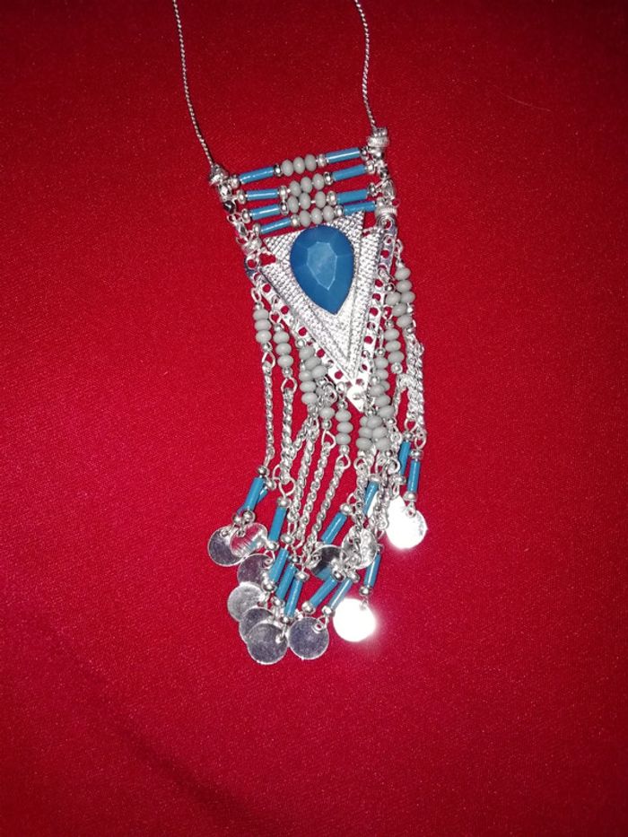 Très jolie collier. Je le trouve très beau mais je n'ai pas l'occasion de le porter. Argenté et bleu. Pensez au lot 😉 réduction activées.