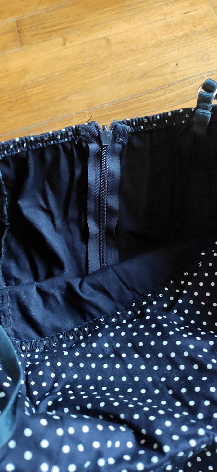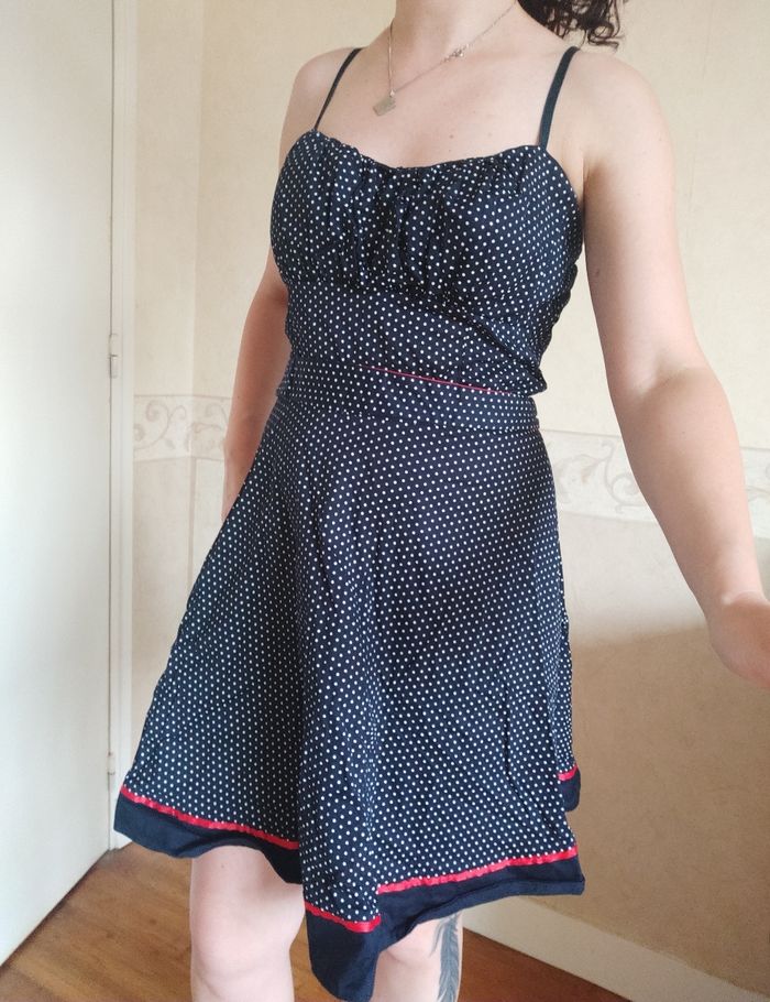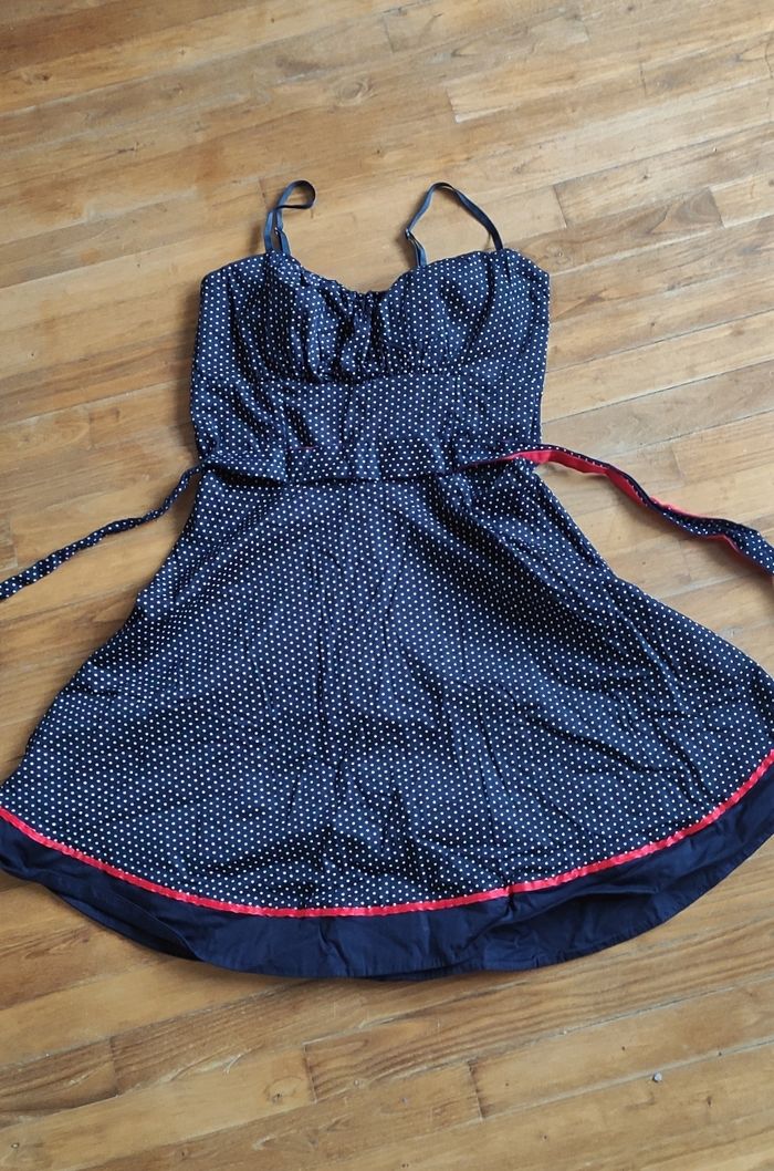 Jolie robe à petit pois style pin-up vintage, avec fermeture au dos. Et ceinture pour resserrer à la taille.