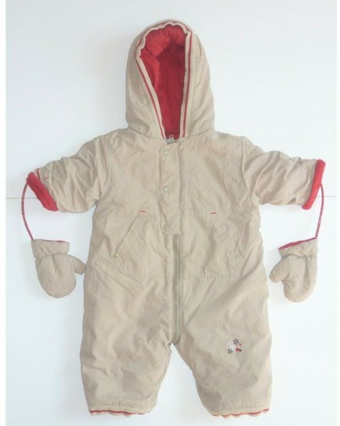 Combipilote doublée bien chaude beige avec pointes de rouge, fermeture zippée devant et moufles intégrées Bébé sera bien au chaud pour partir en promenade Obaibi Vide dressing professionnel