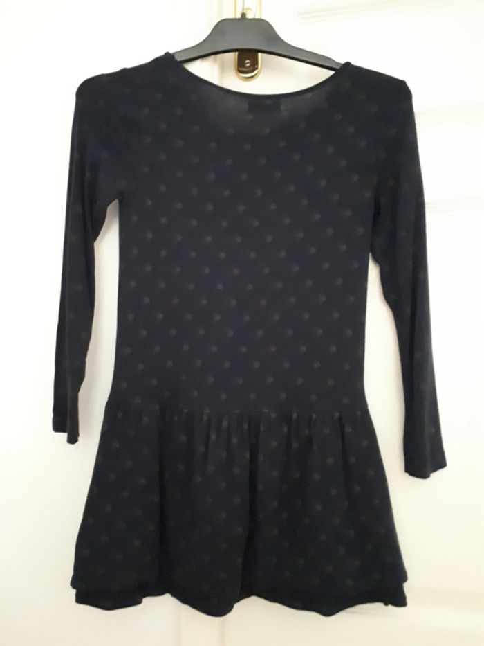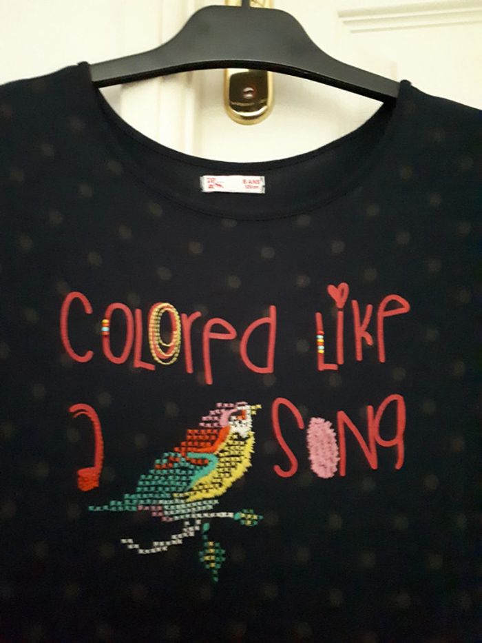 Superbe robe bleu marine à pois taupe ave broderie oiseau sur le devant et inscription « coloured like song ». Marque Du Pareil Au Même (DPAM). Pour fille âge 8 ans, 126 cm.