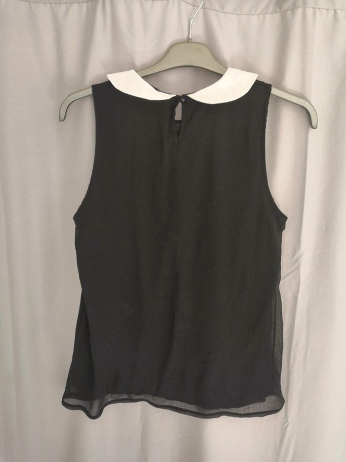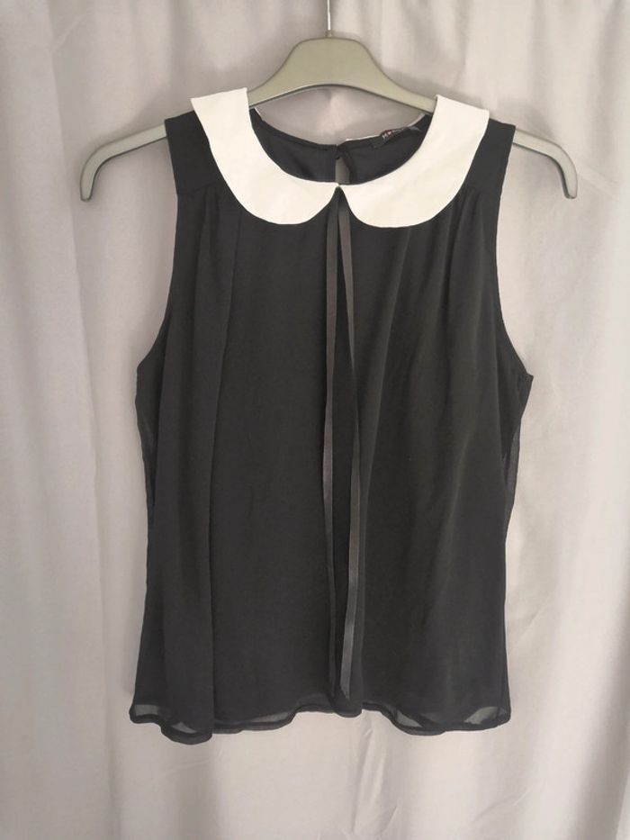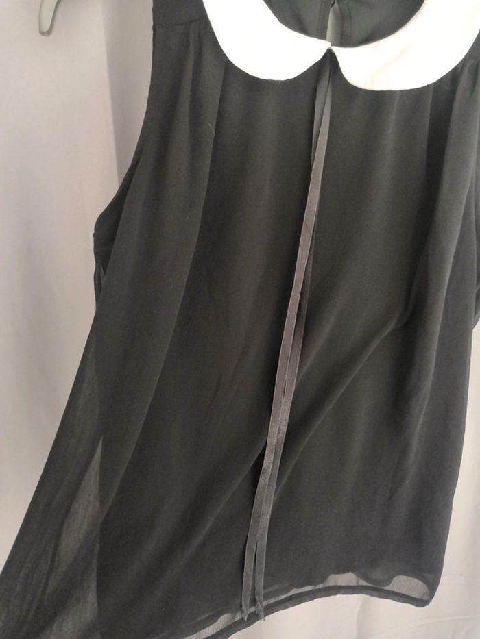 Très joli top voile doublé col Claudine blanc, lacets satinés retombant sur la poitrine. Très classe