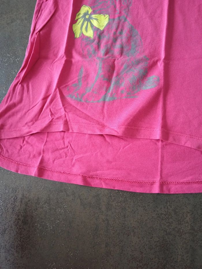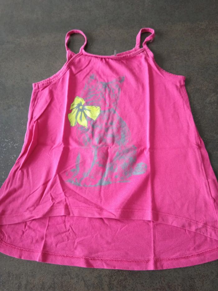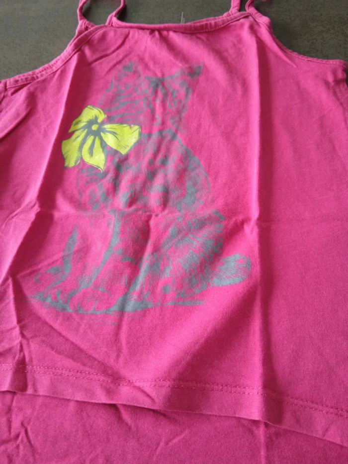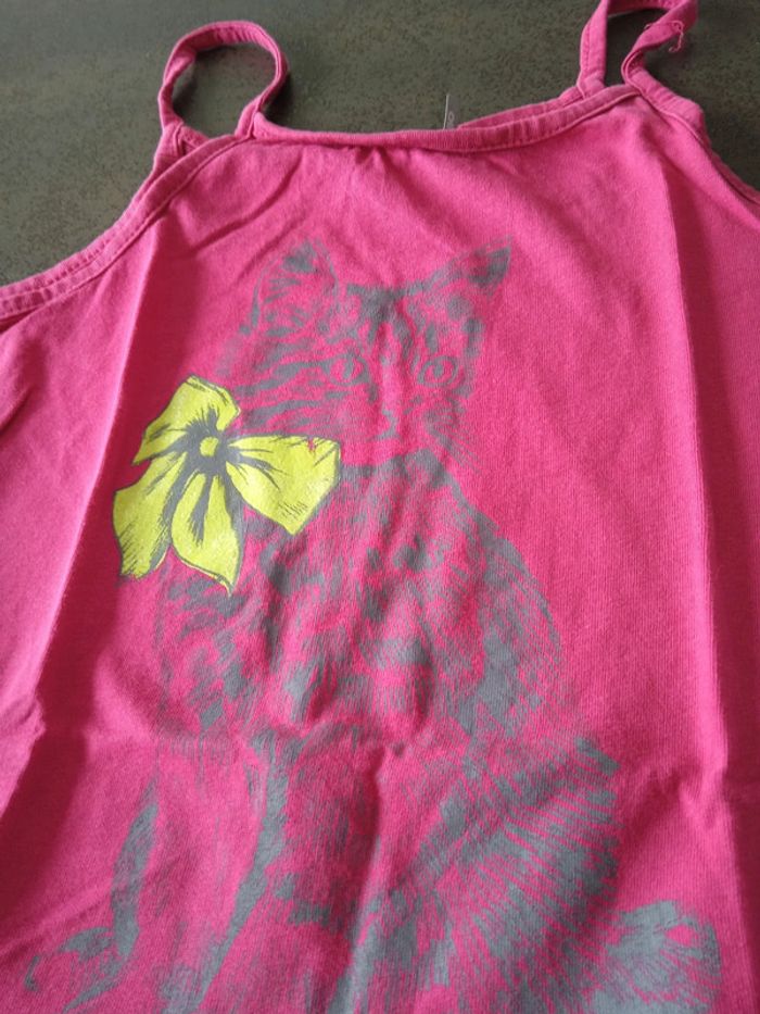 Débardeur fine bretelles rose cours devant plus long derrière motif chat gris et nœud papillon jaune fluo