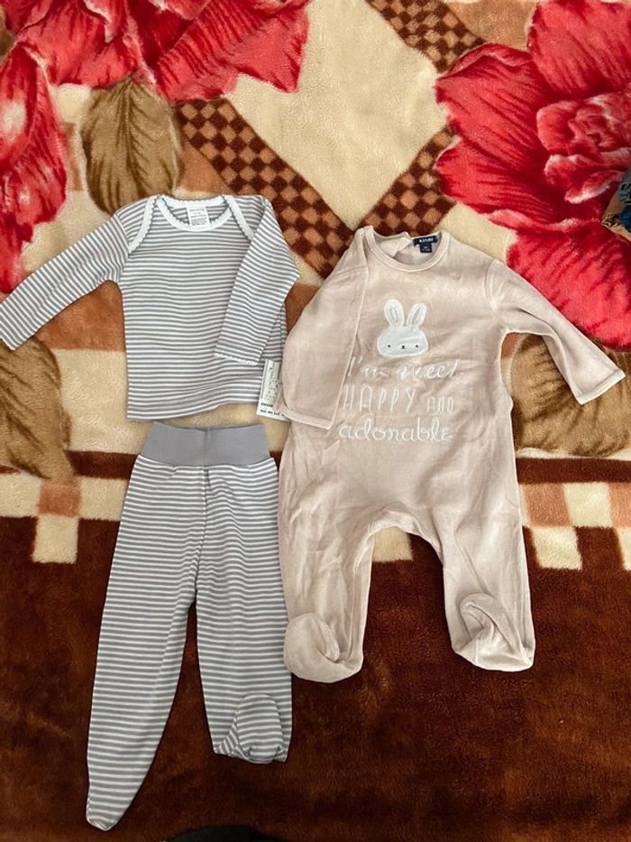 1 Pyjama léger 2 pièces et 1 pyjama grenouillère marron clair avec motif tête de lapin ( 1 légère tache sur le motif)