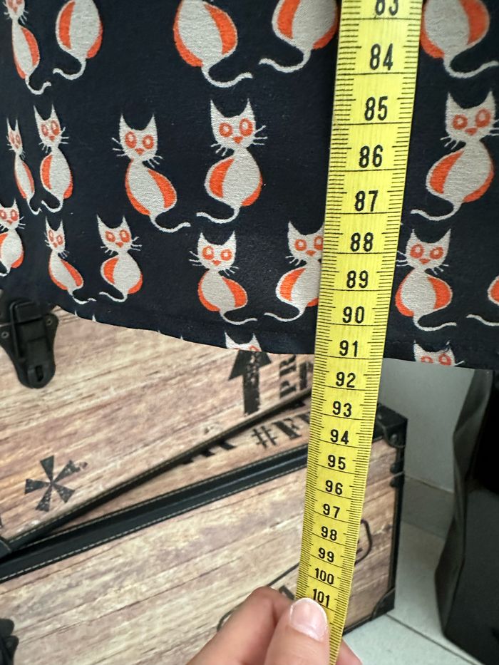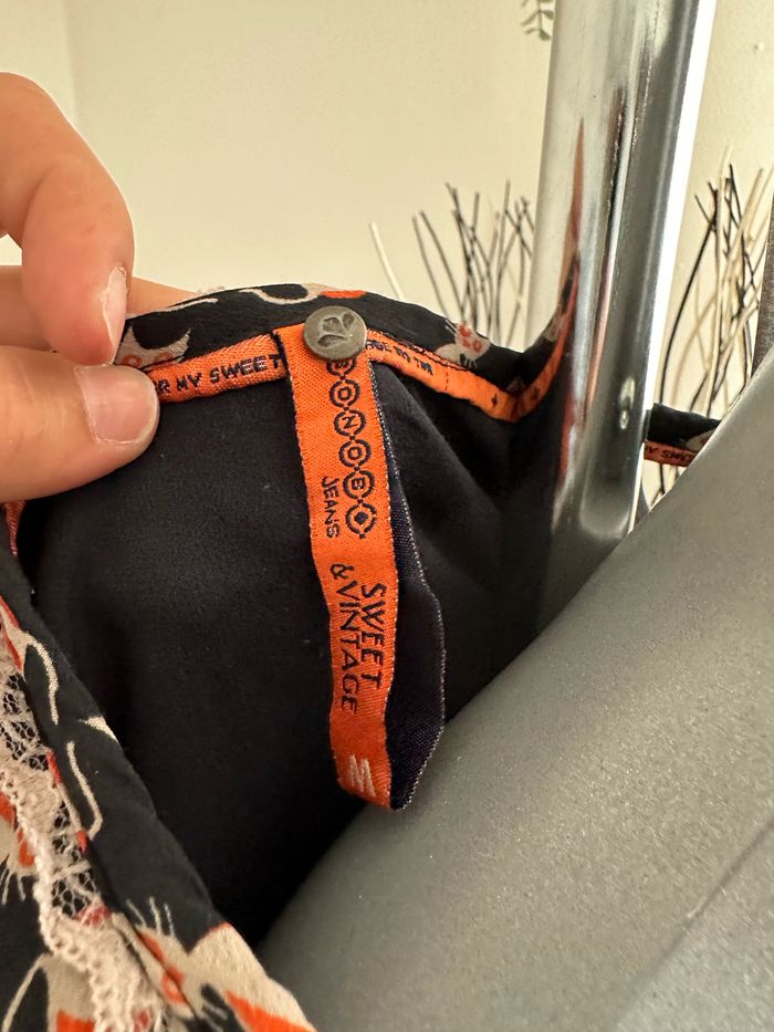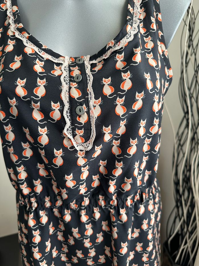 Robe noire à motifs colorés , galon en dentelle blanche à l’encolure , boutonnière décorative sur le devant , sans manches , élastique fin intégré à la taille , passants pour ceinture fine Taille M. Bonobo. Seconde main en très bon état