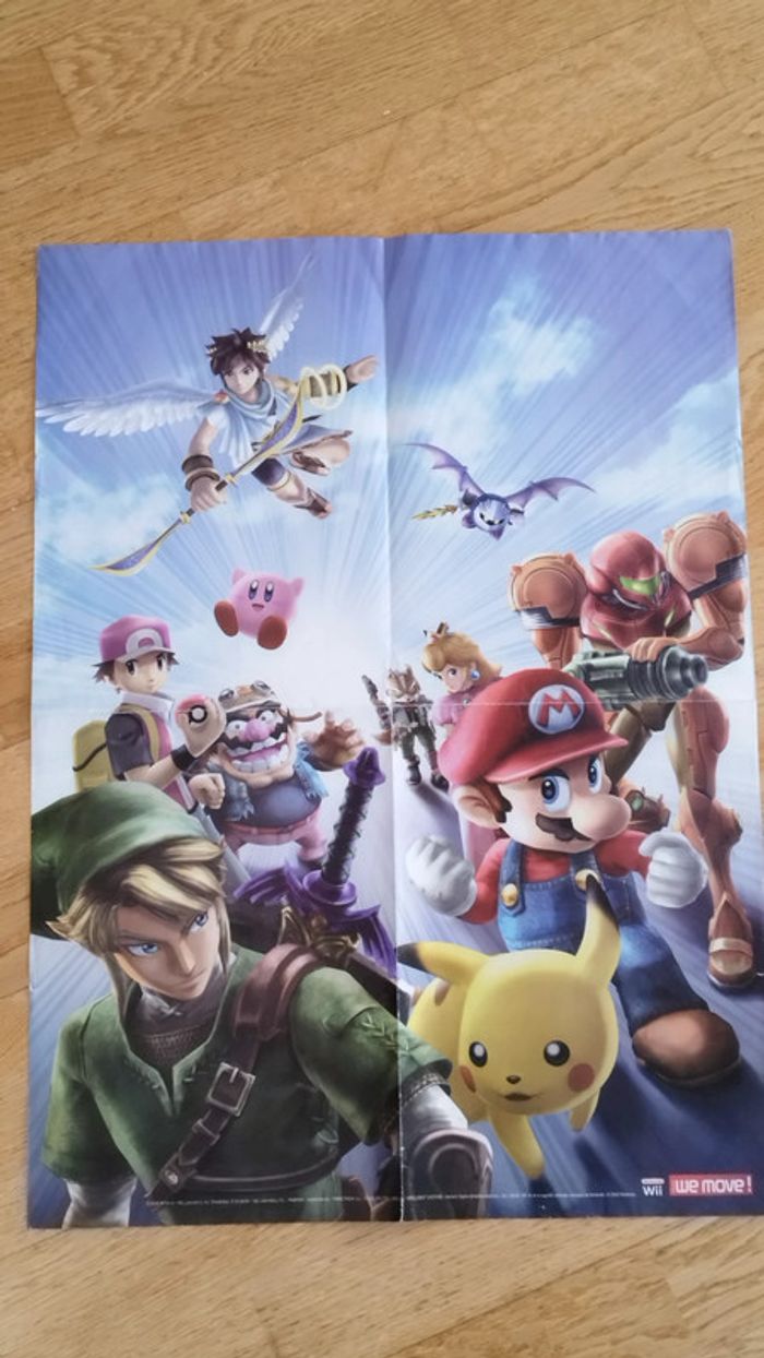 Grand Poster Super Mario / Metroid / Pokemon / Zelda / Super Smash Bros (recto / verso ) 63 cm sur 44. Il est pas mal usé avec quelques pliures