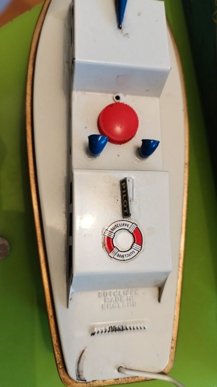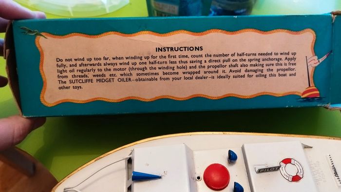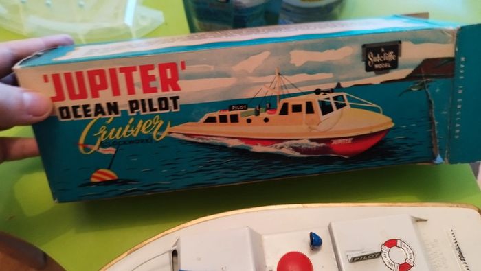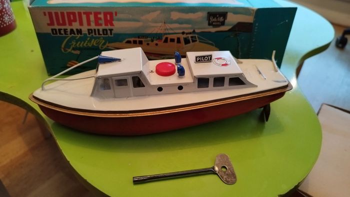 Bateau mécanique SUTCLIFFE JUPITER OCEAN PILOT Clockwork CRUISER datant de 1960 Boite déchiré à un endroit, la clé est présente.
