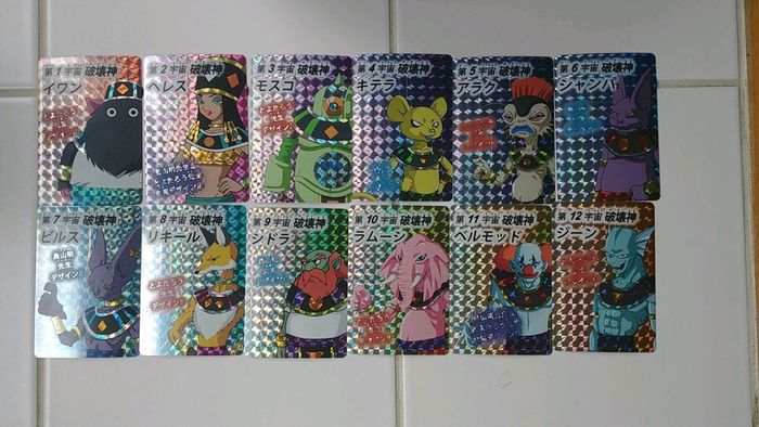 Lot de 12 cartes Dragon Ball Super représentant les Dieux de la destruction des différents univers. FANCARD