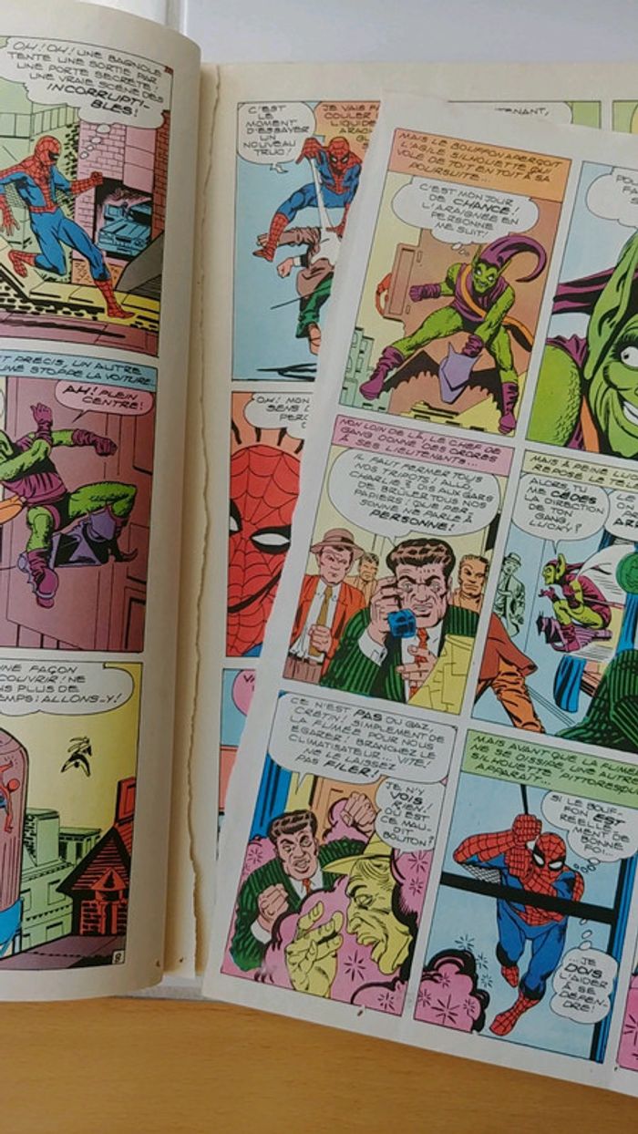 Comics Spider man Marvel presente Une aventure de l'araignée La folie de l'araignée edition lug datant de 1981 écrit par Stan Lee et Steve Ditko Une page arraché mais encore présente (voir troisième photo)