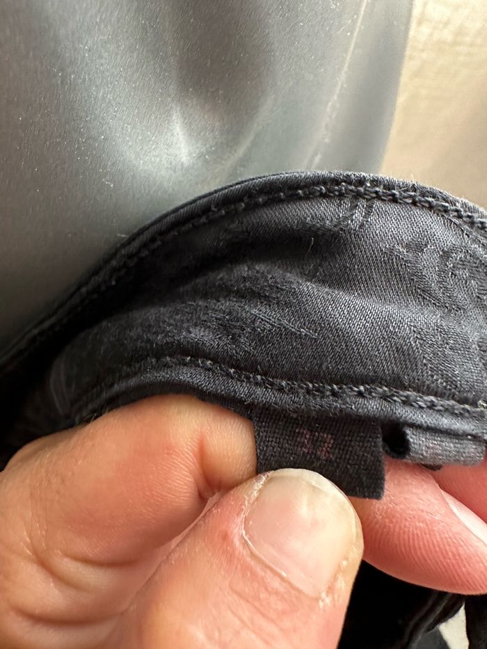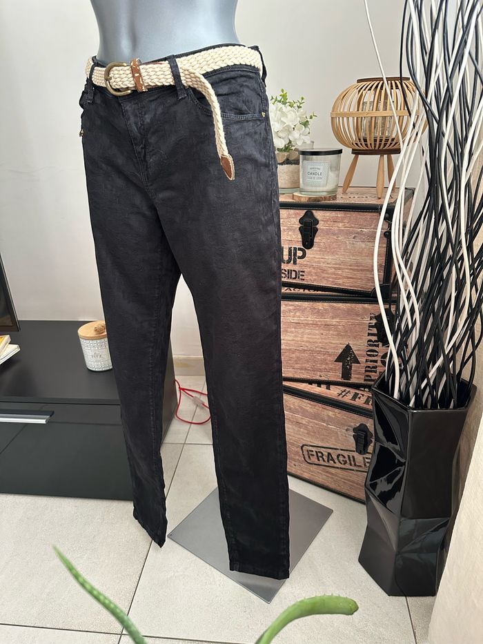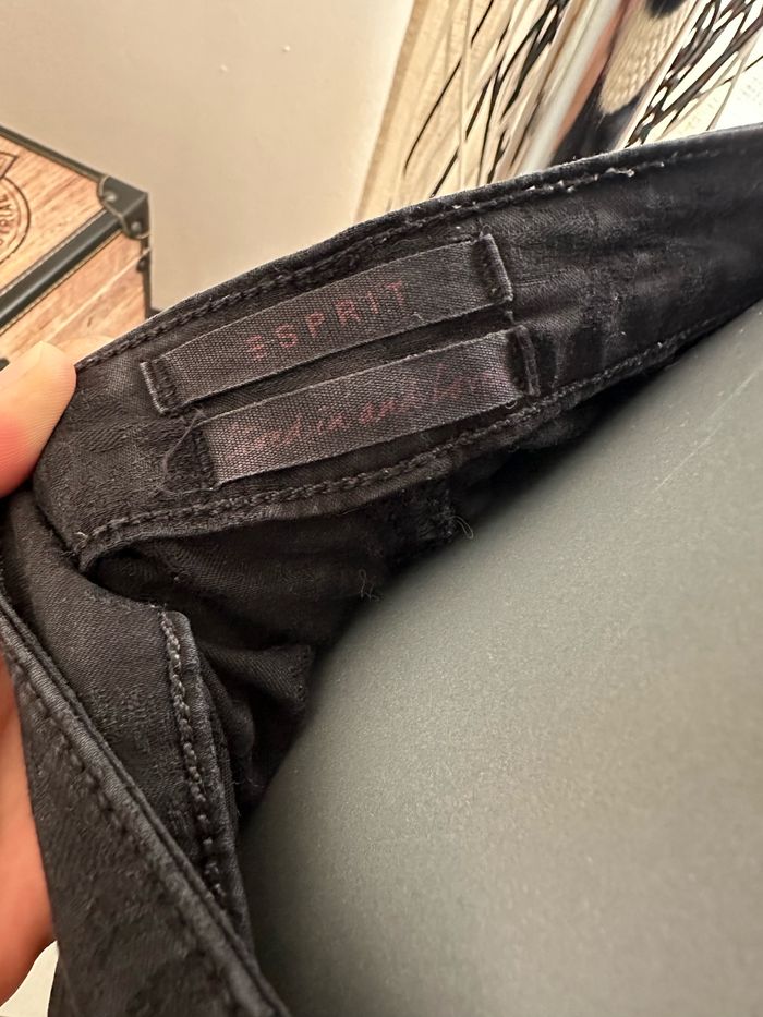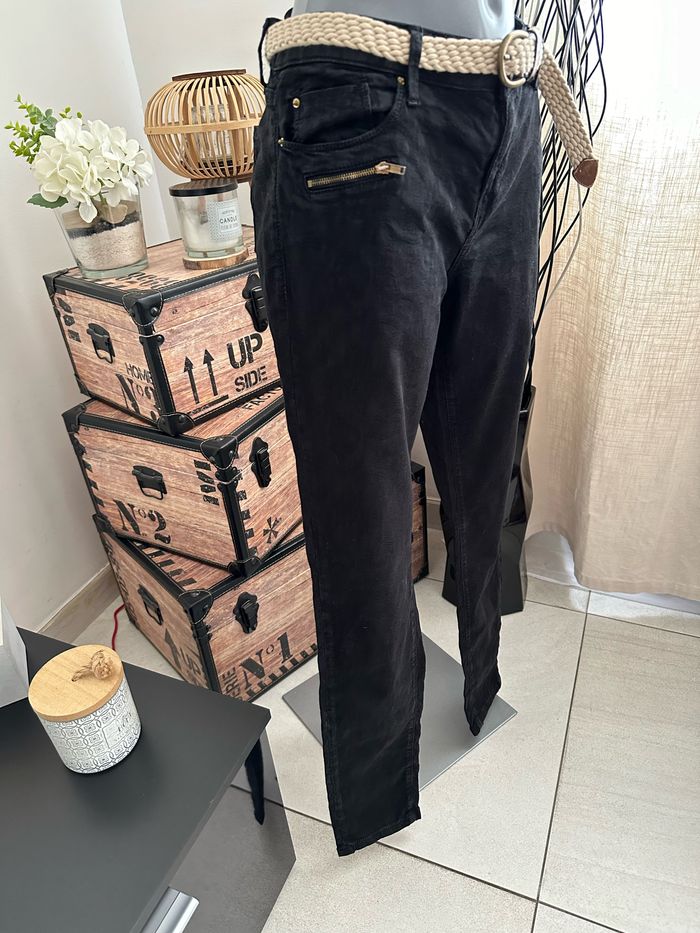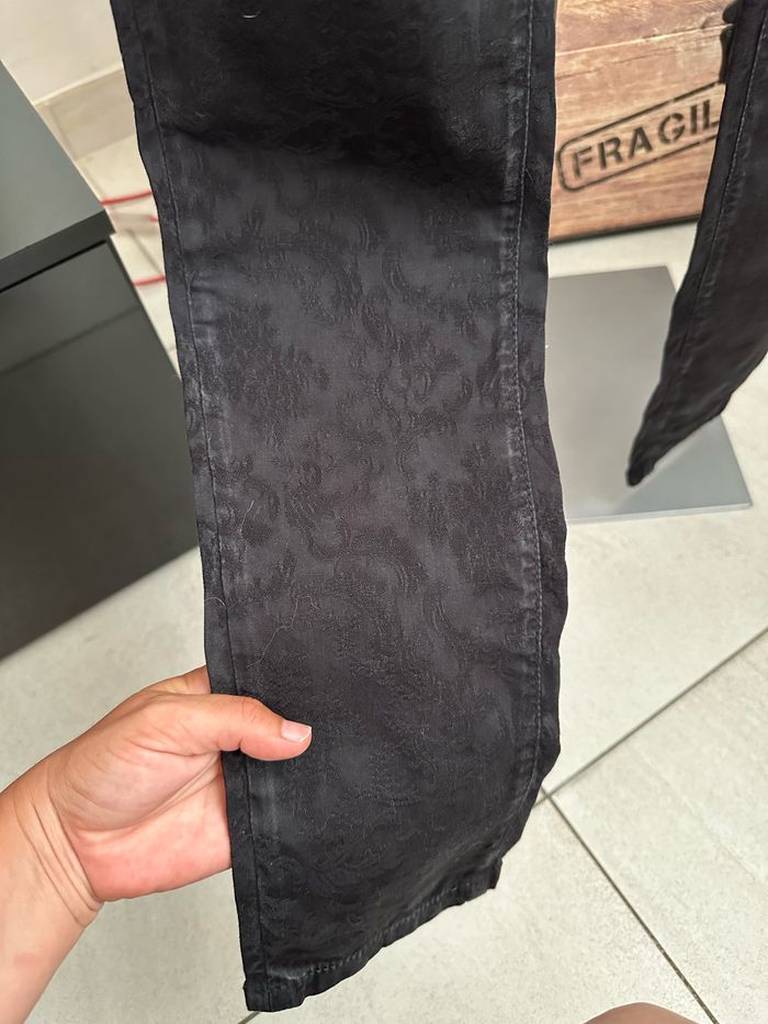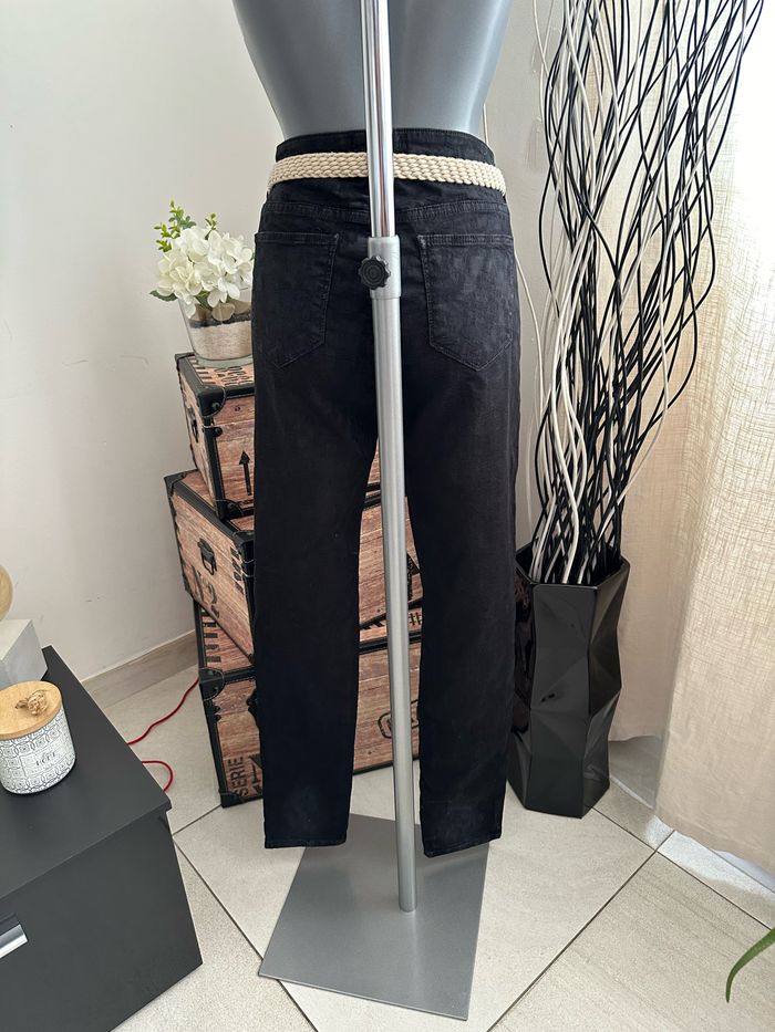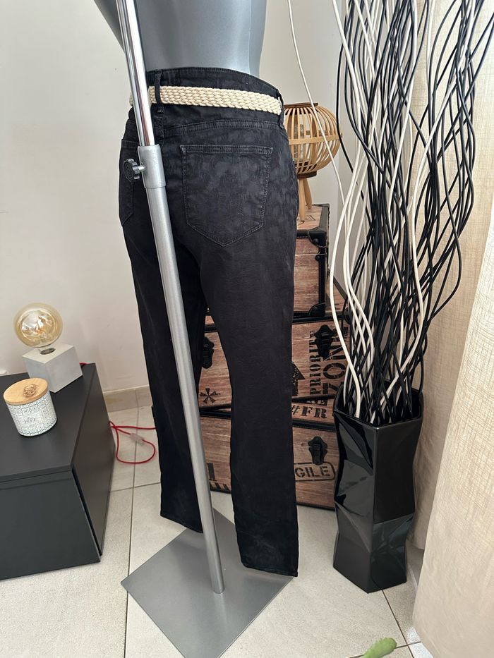 Jean slim noir , décoration noire style baroque , matière légère , poches sur les côtés devant et poches arrière , passants pour ceinture Taille 38. Esprit. Seconde main en très bon état