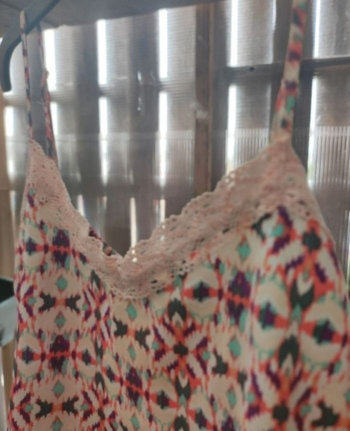 Débardeur a bretelles réglables fluide et léger aux couleurs pastels et motifs asymétrique de chez la halle. Taille 46 Jamais porter