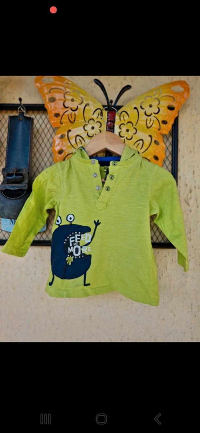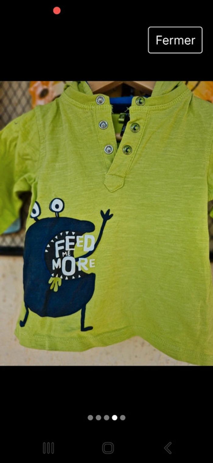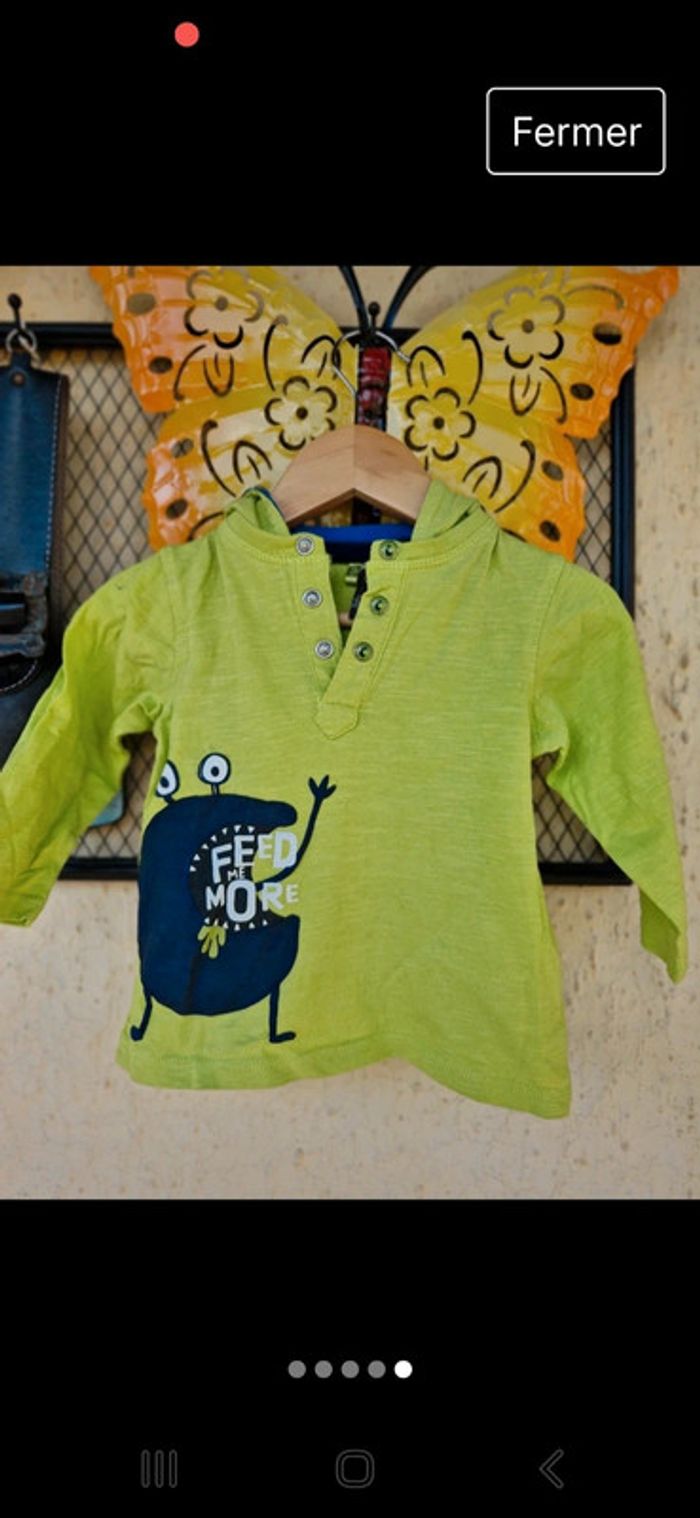 #manouwgarcon12mois Tee shirt garçon, avec capuche, manches longues, 100% coton couleur vert avec dessins noirs. Taille 12 mous. Marque orchestra Très bon état