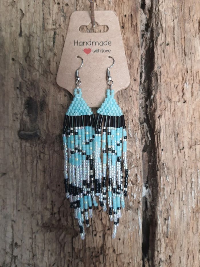 Boucles d'oreilles pendantes handmade avec joli motif de fleurs sakura bleues. Tissage de miyukis.