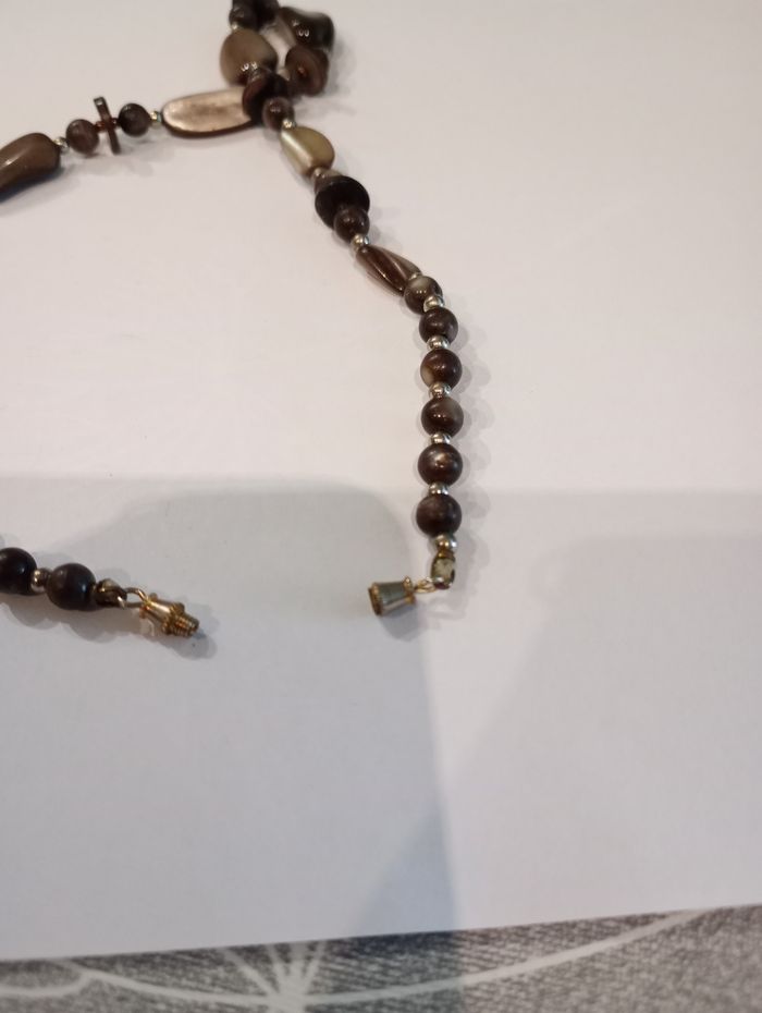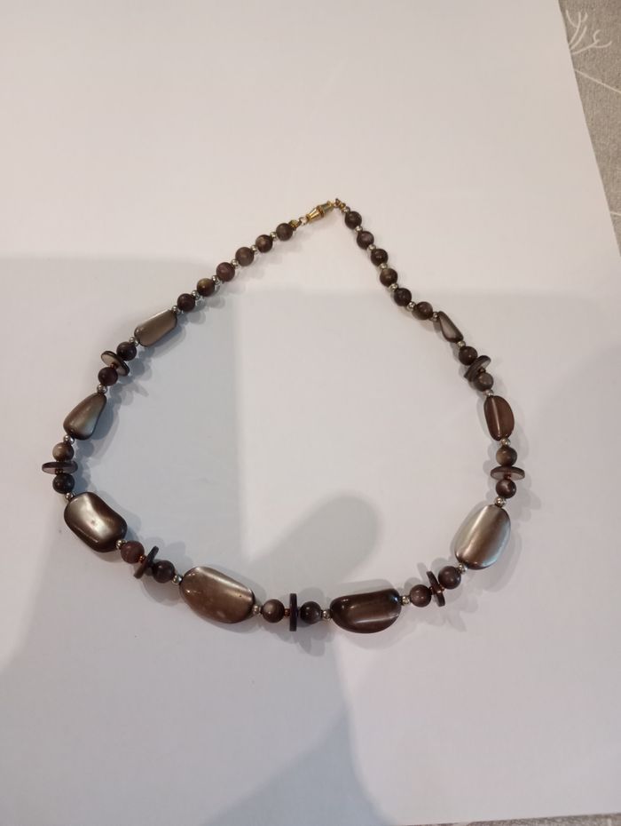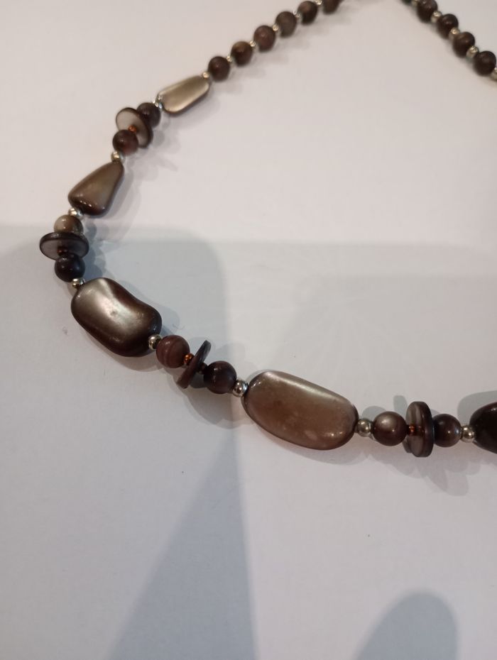 Collier avec pierres marron-noir avec reflets. Longueur totale : 38 cm. Très bon état.