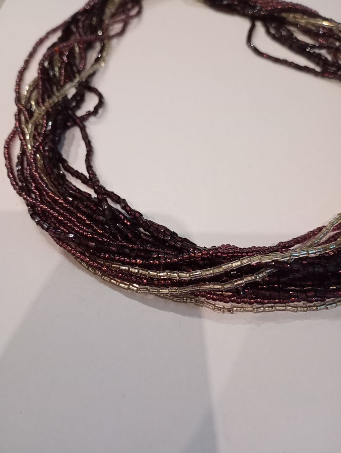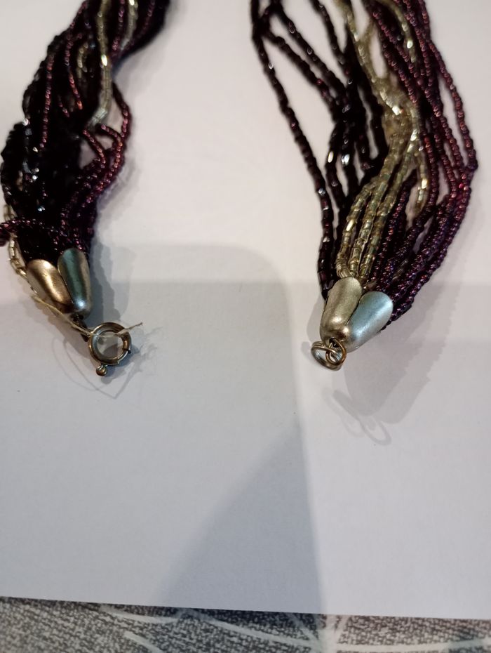Collier avec petites perles violettes et transparentes. Longueur totale : 48 cm. Très bon état.