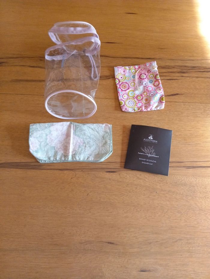 Trousse ronde transparente décathlon Petite pochette en tissu fait main pour lingettes ou autres 1 petit mouchoir fleuri Yves rocher 1 bonnet de douche en plastique algotherm neuf